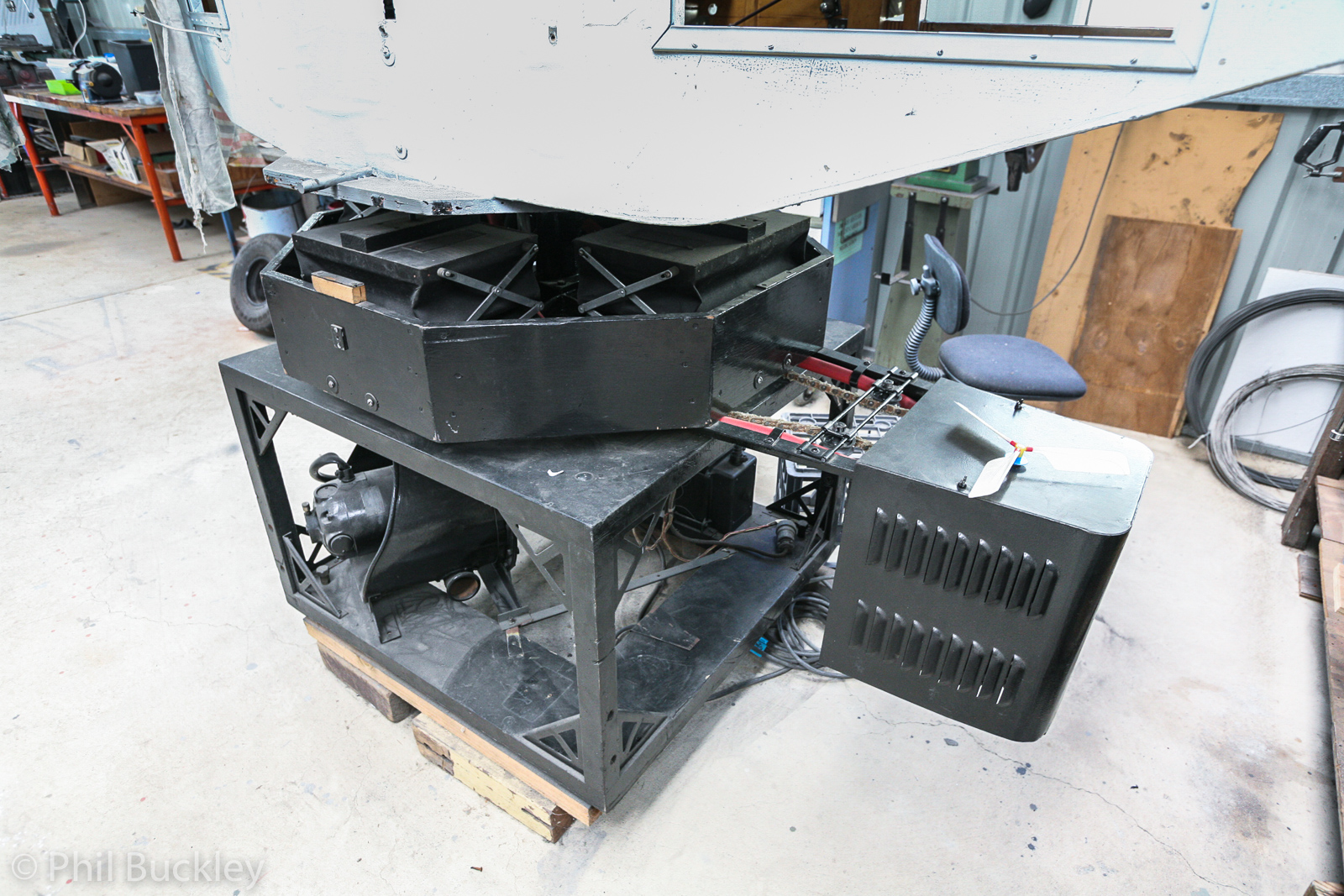 The motorized gimble assembly upon which the Link Trainer is mounted. This machinery would move the enclosed ‘cockpit section’ above in accordance to the control inputs from the trainee pilot, to give them some sensory feedback on their actions. (photo by Phil Buckley)