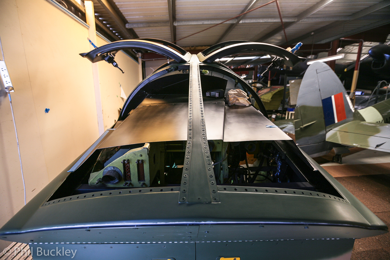 A head-on view of ther F-111 trainer during the early stages of its restoration. The tail of Spitfire Mk.22 PK481 is visible in the background. (photo by Phil Buckley)