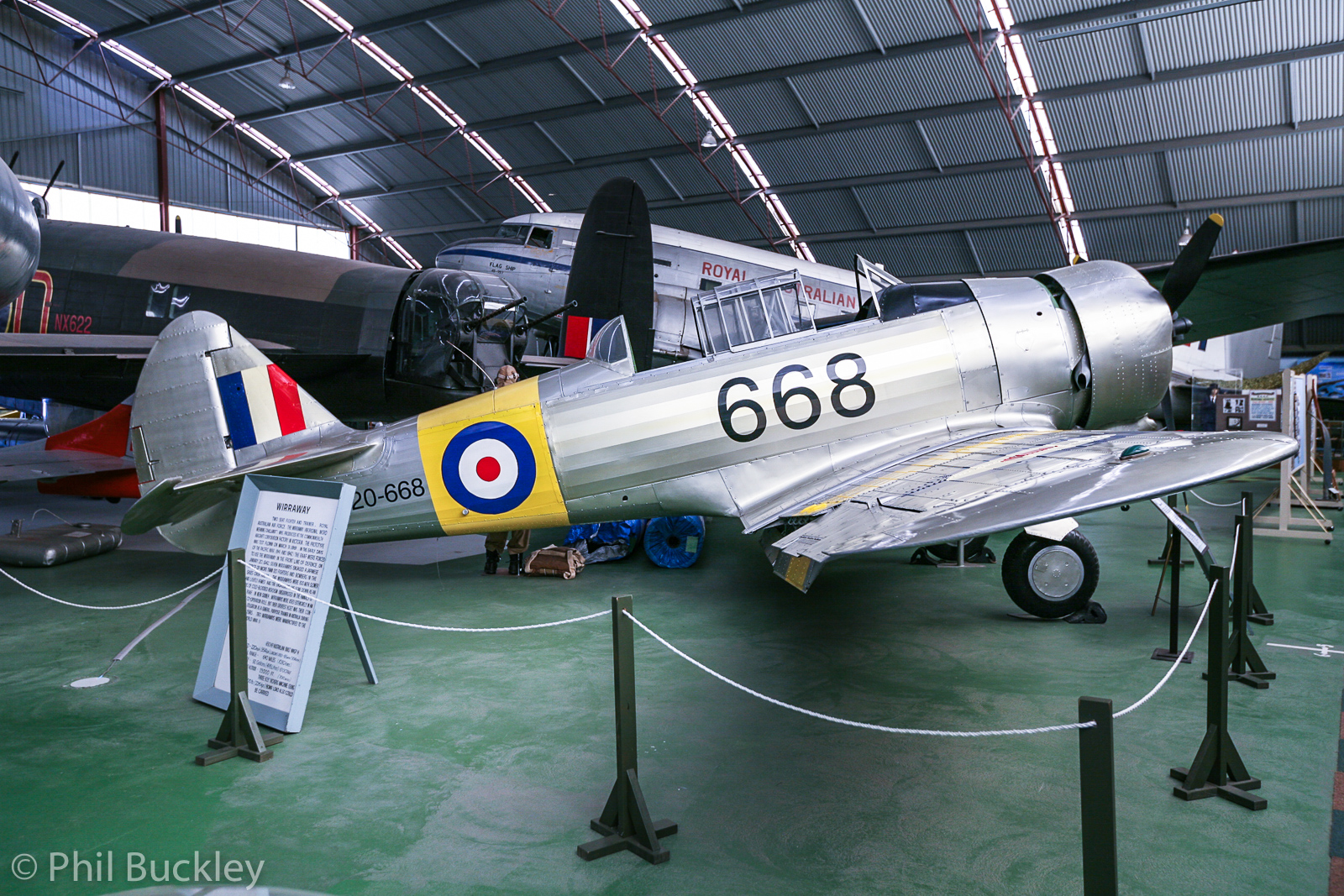 The museum’s CA-16 Wirraway A20-688 (painted as A20-668, a 5 Squadron example). Based on the North American NA-16, this aircraft was designed and built in Australia. The RAAF mainly used it as a trainer, but armed a few early examples for use as stopgap fighters during the dark early days of the Pacific War. (photo by Phil Buckley)