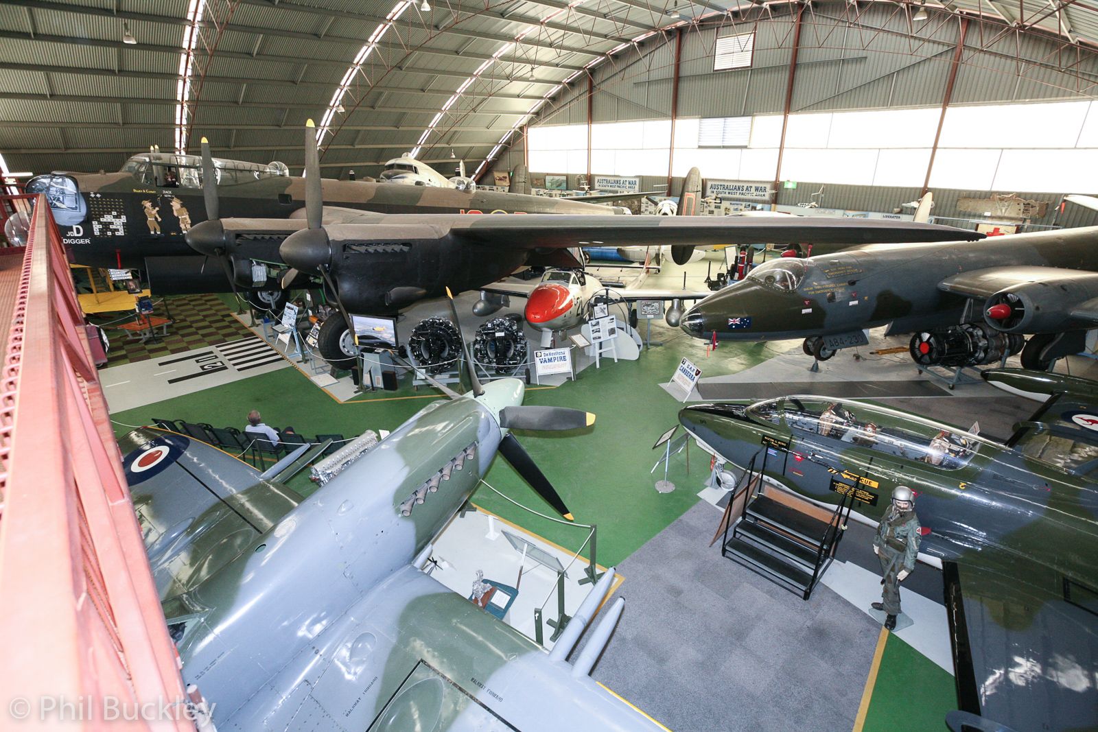 The main hangar space features several historic aircraft including Lancaster B.VII NX622, Spitfire Mk.22 PK481, GAF-built EE Canberra A84-230, and Macchi MB.326H A7-066. The Spitfire was once on the pole out front of the museum, but was replaced by the fibreglass replica currently on display. (photo by Phil Buckley)