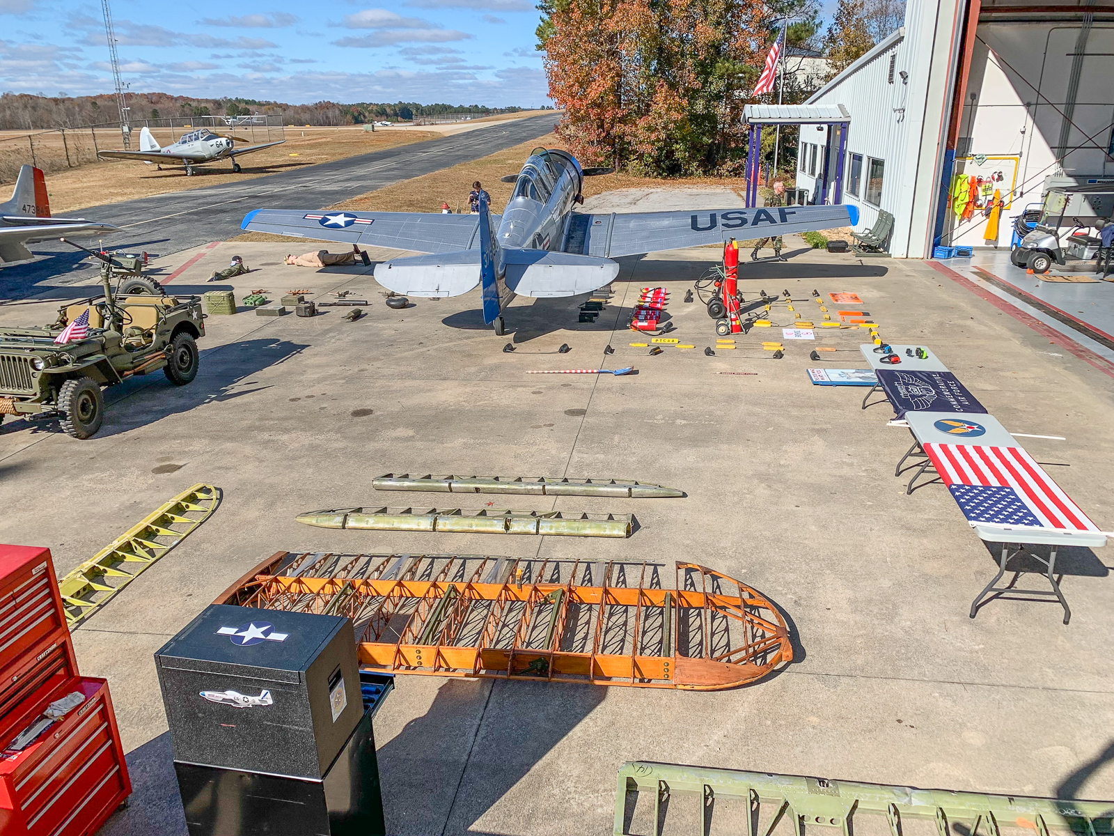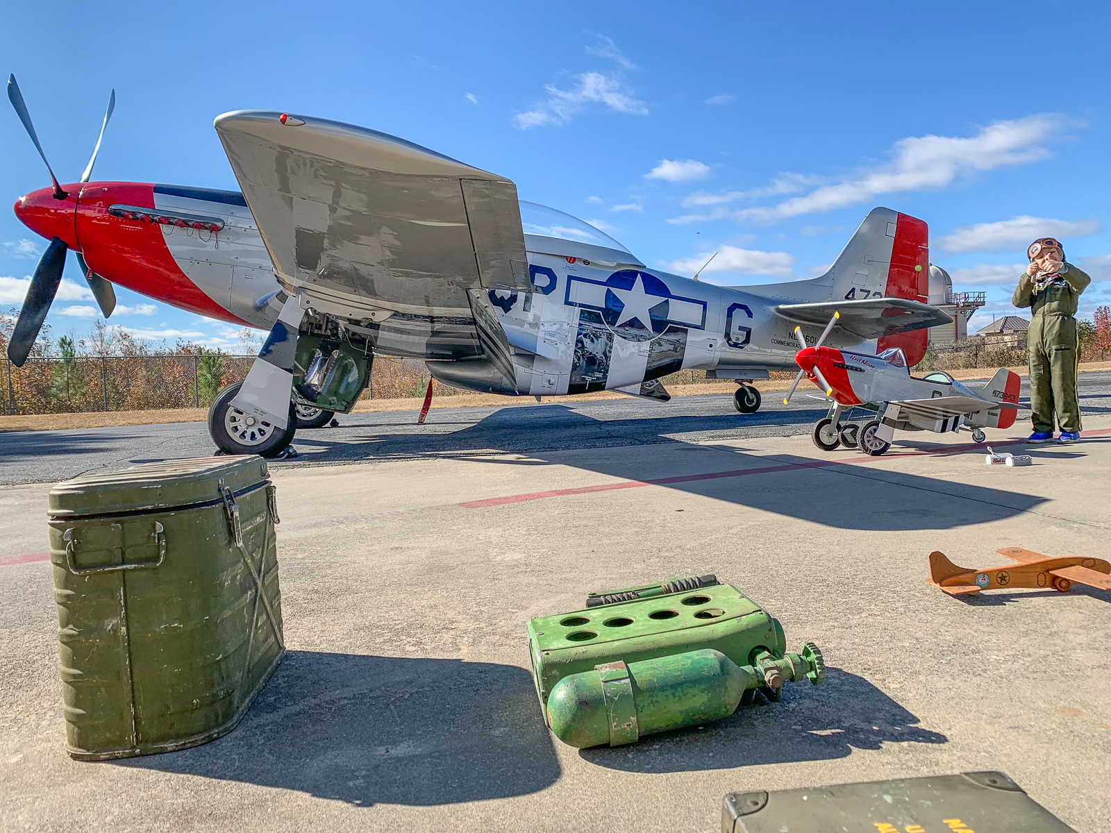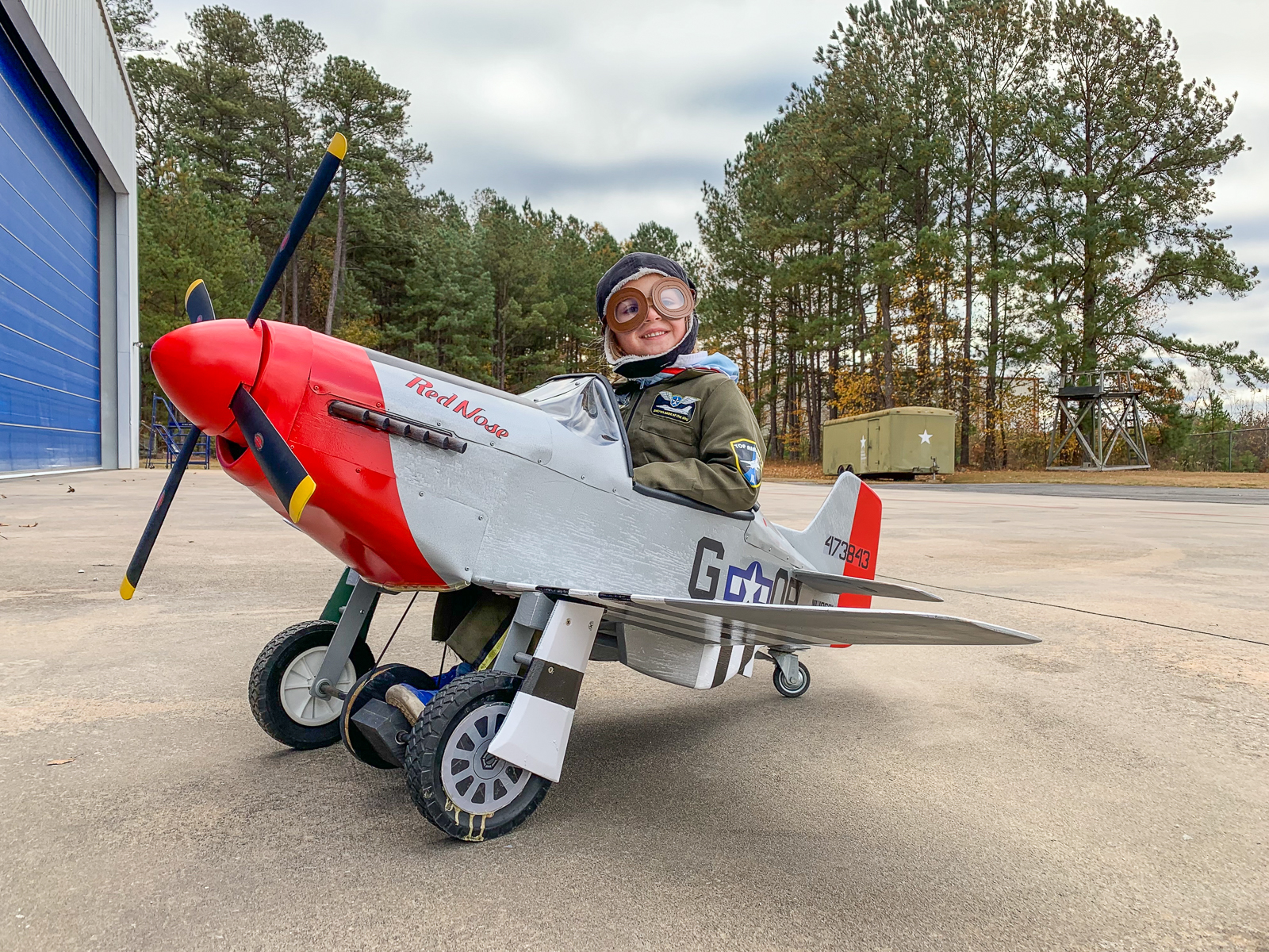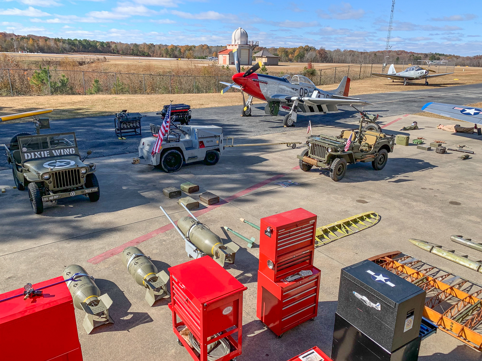 An amusing game one can play when viewing this composition is to try and identify all of the items that the Dixie Wing volunteers included. Due to the limited space available on the ramp in front of their hangar, only include four of the wing’s seven aircraft could play a role, but those that took part did so in style! On the bottom left is the unit’s FG-1D Corsair which is one of the first aircraft to join the Commemorative Air Force fleet, in 1961. This Goodyear-built Corsair wears the colors of WWII Marine aviator Lt M.O. Chance, who flew with VMF-312 in 1945. Another iconic airplane in the photo is the mighty Red Nose (top right) – the P-51D Mustang which gave the CAF its start in 1957. The U.S. Navy Beechcraft T-34 Mentor in the top left represents the latest restoration which CAF Dixie Wing volunteers completed. Other interesting items in view are a B-24 nose turret, replica WWII 1,000lb and 500lb bombs, the magnificent Rolls-Royce Merlin engine, the remarkable Willys Jeep and two post-WWII aircraft tugs. Perhaps the most interesting, non-flying artifacts however, are the original 1940s wooden Boeing B-17 models located right behind the left trailing edge of the North American LT-6 Mosquito. The Dixie Wing has a very large collections of 1940s toys – shaped as airplanes, tanks and ships. Sticking to wooden toys, the watchful eye must have notice a second P-51 – albeit a pedal-plane P-51 variant that is! You can see it right behind the left wing of the life-sized Mustang – a smaller, wooden Lil’ Red Nose provides entertainment for younger visitors at the Dixie Wing Museum.