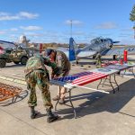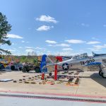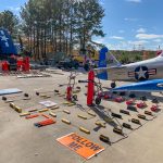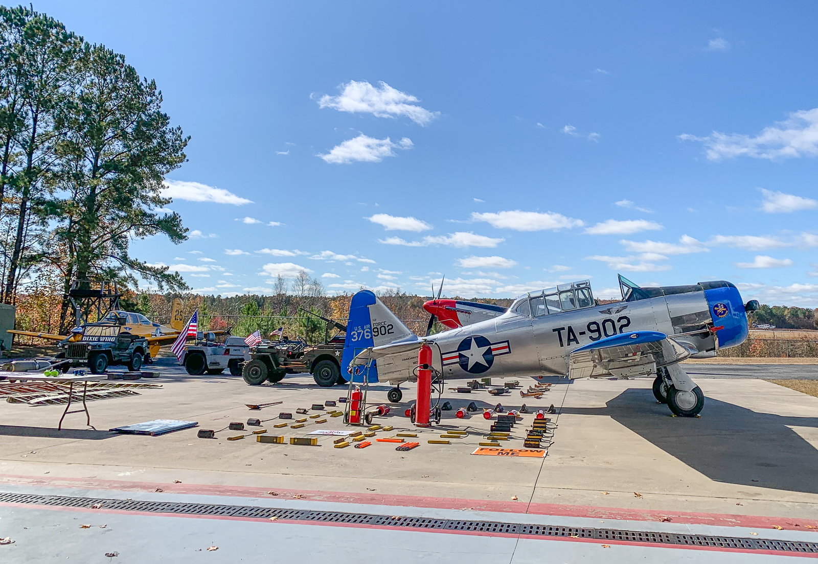 In many respects, the Dixie Wing is one of the most proactive units of the Commemorative Air Force when it comes to marketing and promoting their organization’s mission via social media. Last week the volunteers organized a photo-shoot, with support from Georgia Aerial Systems & Photography, a local drone operator. Setting the stage took about 3 hrs and about 30 mins of flight time for the drone to capture all of the photos! The only setback resulted from the lengthy time it took to get everything set up – the sun moved behind one of the nearby trees, casting a large shadow over the Dixie Wing’s T-34. However, thanks to a little Photoshop magic, the photographer was able to pull out the details from the darkness.