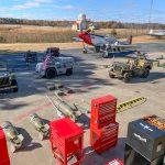 So what about in the Warbird community you might ask? Other than the brief hint in the Israeli Air Force image, we hadn’t seen anything that focused on vintage military aircraft until the CAF Dixie Wing published a few photos of their own crack at the Tetris Challenge a couple of days ago. The marvelous composition, as you can see below, shows four of the airplanes from the Wing’s collection, unit volunteers and some of the vehicles and equipment they use to maintain and restore their aircraft.