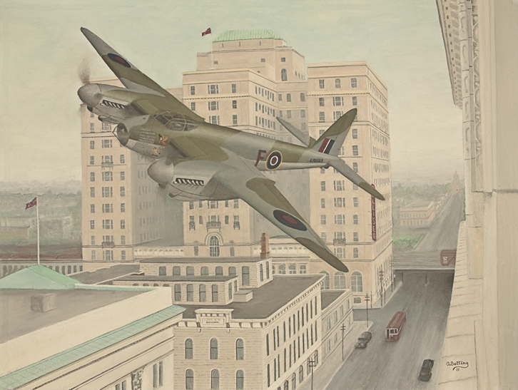 Without a doubt one of the most beautiful planes of the era, the end of the war saw them come home with the air forces that campaigned them, notably the Royal Canadian Air Force. One particular plane, Mosquito LR503, known as “F for Freddie,” late of 105 Squadron and survivor of 213 operations over occupied Europe, more operational sorties than any other allied bomber during World War II, captured the imagination of the Canadian public. Flown by combat decorated heros, the plane performed in a war bonds tour of Canada, famously performing an astounding aerobatic demonstration over (and through) Calgary on May 9, 1945 in celebration of the war’s end in Europe, shooting under low bridges and buzzing down avenues below building roof height. RCAF staff working on the sixth floor of the Hudson Bay building recall having to look down to see the Mosquito streaking past below their windows at over 300MPH.