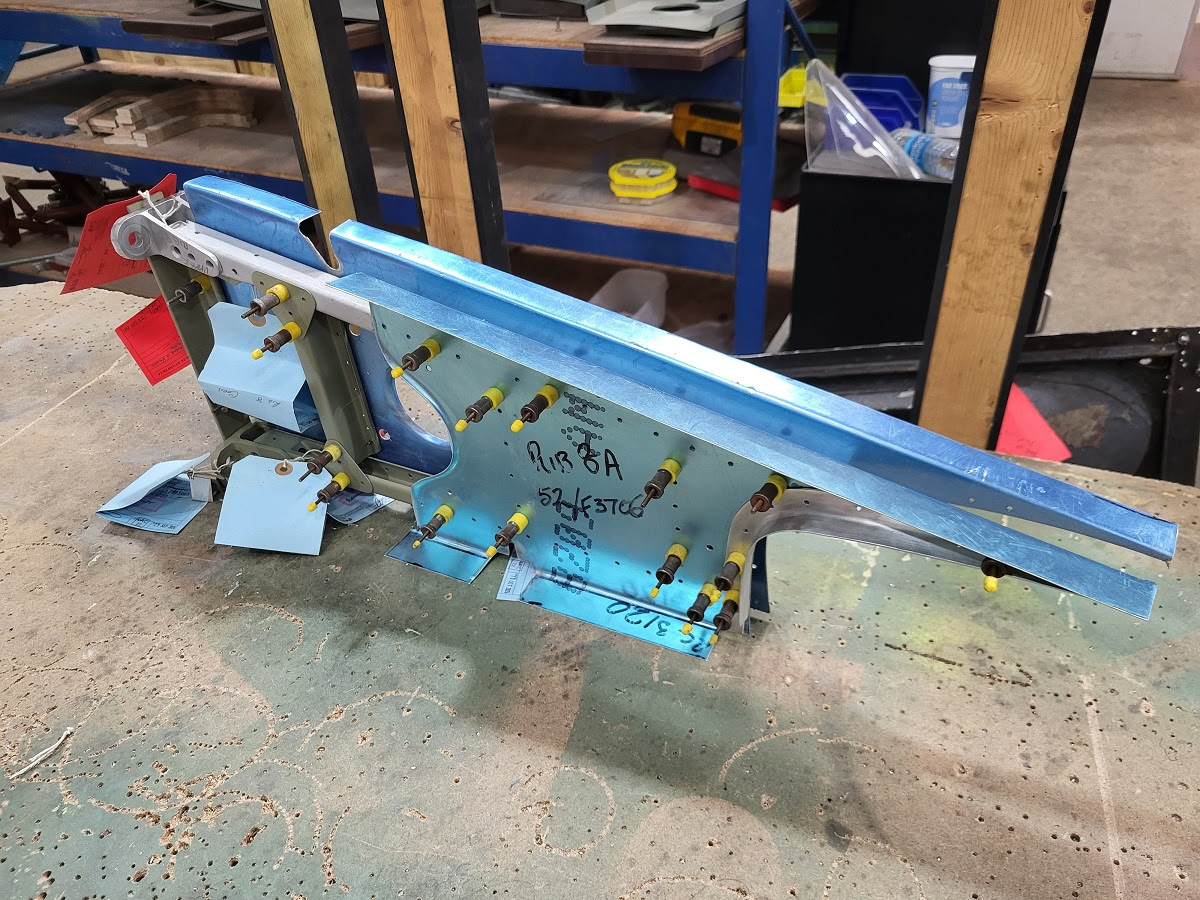 Chris and Dennis have been hard at work on the port wing’s trailing edge ribs. Using original extrusions, they’ve built up and trial-fitted the sheet ribs into the jig. Each rib has had its lightening holes drilled and flanged, and attachment holes copy-drilled from the original corroded examples. Once trial-fitting is complete, the ribs will be disassembled, painted, and reassembled for final construction. Meanwhile, John has commenced the reconstruction of the wing ribs from components returned from the paint shop—pinning together the extruded elements and skin sections in accordance with the drawings made during deconstruction.
