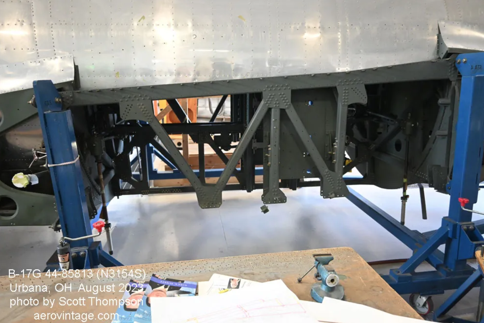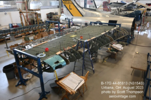 The restoration of B-17G 44-85813, otherwise known as Champaign Lady, continues to make solid progress at Urbana, Ohio. The decades-long effort by the Champaign Air Museum is now concentrated on the rebuilding, really re-creation, of the wing sections, both inboard and outboard. The fuselage itself is nearly structurally complete. The restoration project began in 2005 by Jerry Shiffer, who shortly afterward was killed in an airplane accident. However, his three adult children (Dave, Eric, and Andrea) took up the project and have driven it forward over the past eighteen years. The large volunteer team under the direction of project manager Randy Kemp will complete the rebuild of the B-17G to airworthy condition.