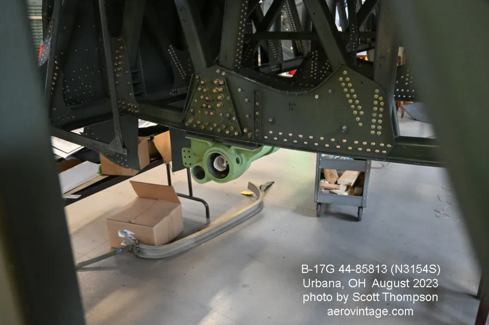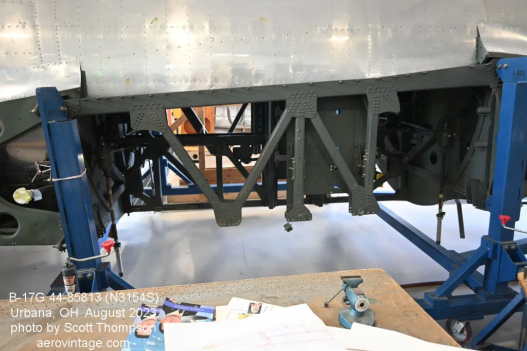 As a recap, the project began as the compilation of the remaining sections of several B-17s. The fuselage was rebuilt from parts of B-17Gs 44-83722 and 44-83316. The inner wing panels came from 44-85813, and the outer wing panels from 44-83722. The vertical stabilizer came from 44-83525. The nose compartment and the radio room compartment had to be built as a new structure. The other subassemblies and components have been gathered from many different sources from around the world. Because a large part of the airframe came from 44-85813 and that airframe had the documented civil history of N6694C, this airplane is moving forward as the restoration of 44-85813 under the new civil registration of N3154S. The long history of this B-17 which, by the way, was one of the three post-war five-engine test beds, is told in words and photos in Final Cut: the Post-War B-17 Flying Fortress and Survivors.
