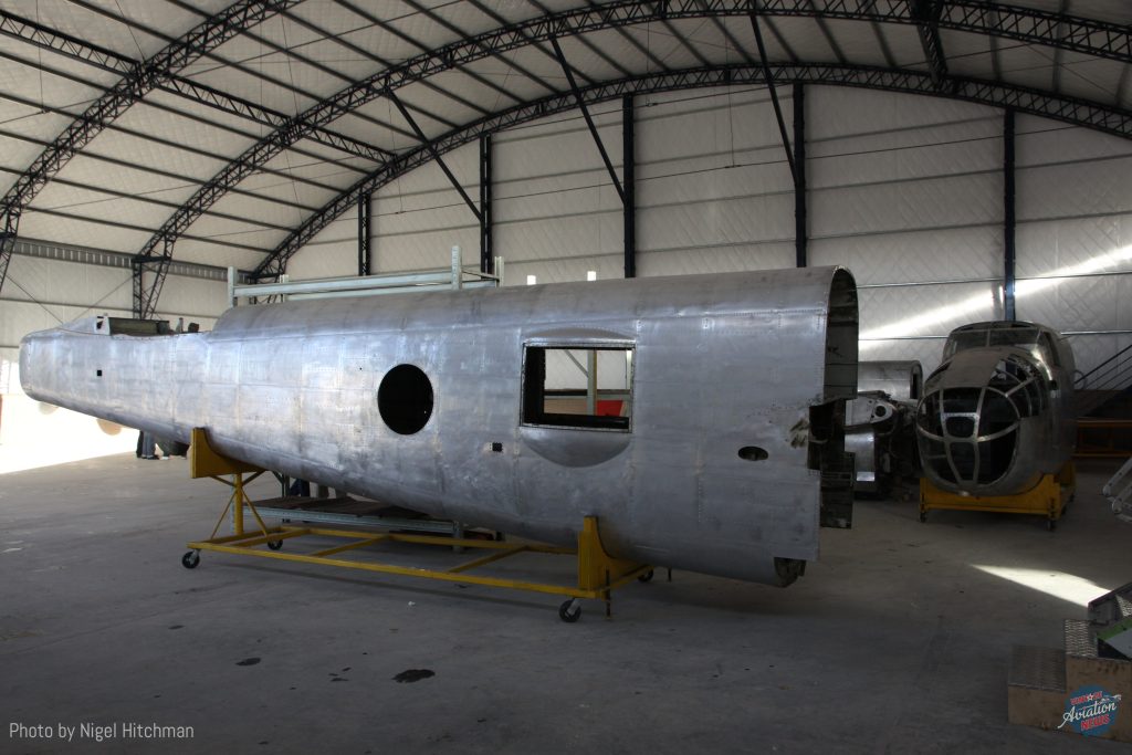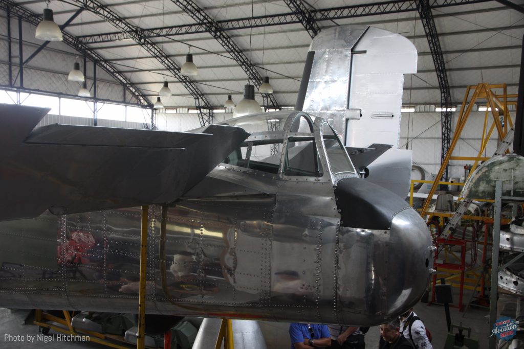 The first job was to completely clean everything and strip all the paint, some skins removed, corrosion removed and treated with alodine, all then painted with etch primer and on top an epoxy paint. Some skins were replaced and parts re-manufactured and lots of equipment overhauled. They had a lot of help with information and some spare parts from Aerotrader at Chino and also the Sandbar Mitchell project team. The leader of the restoration project was Alberto Picallo, a very experienced mechanic who worked for Aerolineas Argentinas for many years on aircraft structures. Sadly he died in Sept 2021, badly missed by the team he lead and everyone involved in the project. Two months later in September, 2011 I was back again, observing the progress on the aircraft and the hangar nearing completion.