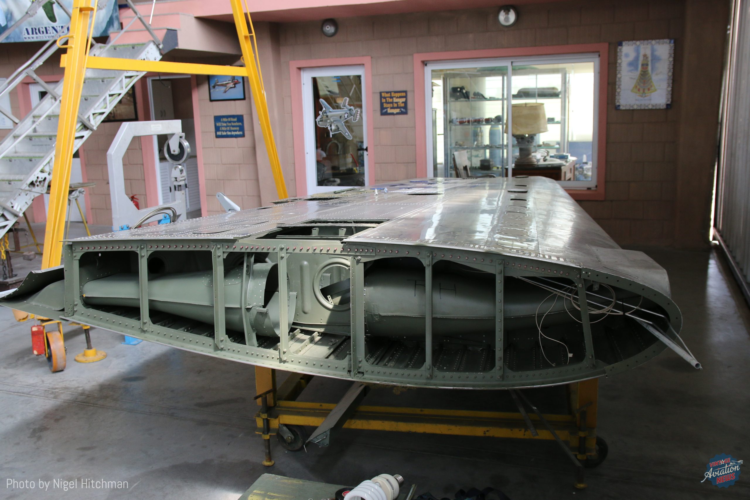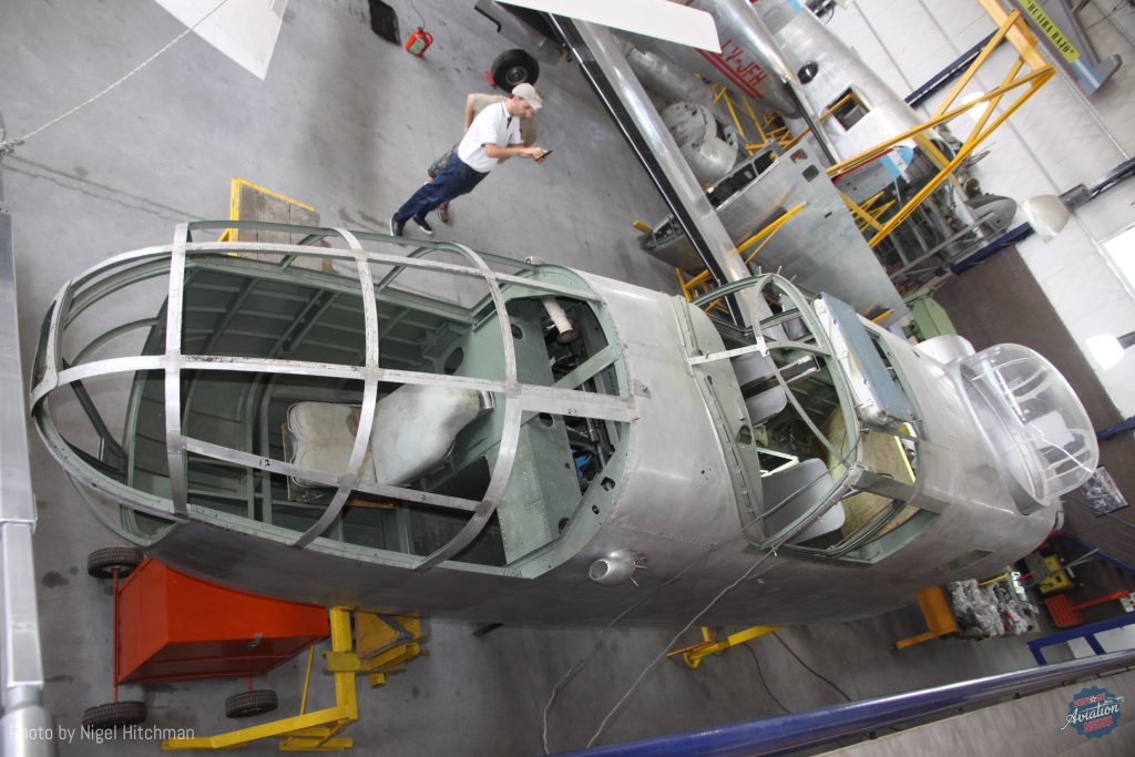 I next visited in March 2019 again for the EAA fly-in. There was lots more great progress in the 15 months since I’d last seen the B-25. By now all the cockpit glazing was in place and the newly overhauled engines and propellers had been installed. The Wright R-2600 engines were overhauled by local expert Jose Maria Dagnillo. The outer wings were also now structurally complete with everything cleaned, protected, and painted, and skins re-installed.
