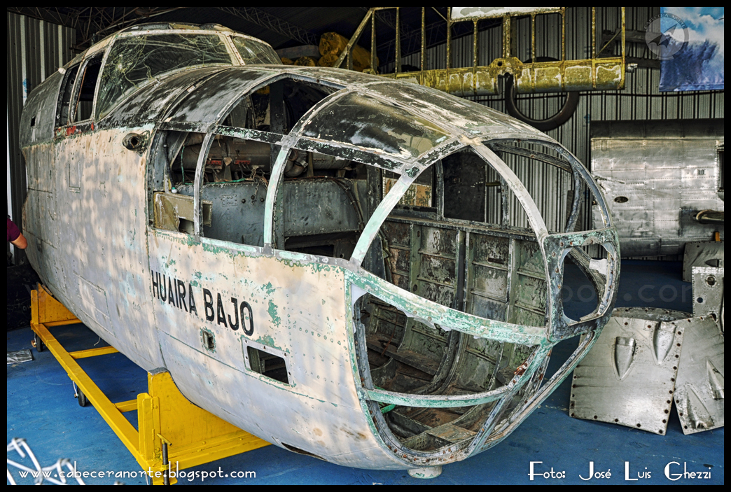 LV-GXH, a North American TB25N Mitchell 44-31173 “BD-173” c/n 108-37248 was originally built as a B-25J but converted to a TB-25N trainer, and delivered to the USAAF in 1944. It remained in the US, operating from Laurel, Massachusetts and Mitchell Field, New York, then was stored at Davis Montham. In June 1961 it was sold to Enrique Denwert and came to Argentina. For its first ten years, it was used to smuggle alcohol and cigarettes from Paraguay to Argentina mostly to Mar Del Plata, until one day in 1971 it made an emergency landing in Santiago Del Estero (some accounts say due to running out of fuel, others due to engine failure). It was impounded and confiscated by the province of Santiago Del Estero. It was then given to the local provincial airline “Empresa Provincial de Aviación Civil” who operated it from Santiago Del Estero mostly on aerial photography until 1976, when it landed with an engine failure and was abandoned, eventually ending up parked near the aeroclub. There it sat at the mercy of vandals, but luckily here in the north of Argentina to the lee of the Andes, the air is pretty dry, so it didn’t suffer too badly due to corrosion.
