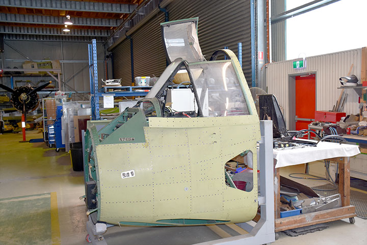 We recently visited Albion Park to view the aircraft on display awaiting its rebuild resumption. Most of the components of the fuselage have already received some structural restoration, with the cockpit and stern frames already rebuilt structurally. The nose/cockpit for this project came from the British-built Beaufighter Mk.1f X7688, once an engine test rig for training technicians at RAF Halton. Greinert purchased this project, which comprised the forward fuselage and center-section with engines, props and many spares, from Tim Moore’s Skysport Engineering in the UK. At present, this restoration will likely use the center section from X7688 too, although there are several other center sections on hand if required. Indeed, the center section has moved back from storage to Albion Park, and is also on display pending the commencement of work, which is expected to begin shortly. This will involve stripping the center section down for assessment, and then follow the normal route of repair and replacement as required. The reasoning behind using X7688’s center section is that it is the most complete and most recently serviceable of those center sections currently available, so it should be less difficult and quicker to restore.
