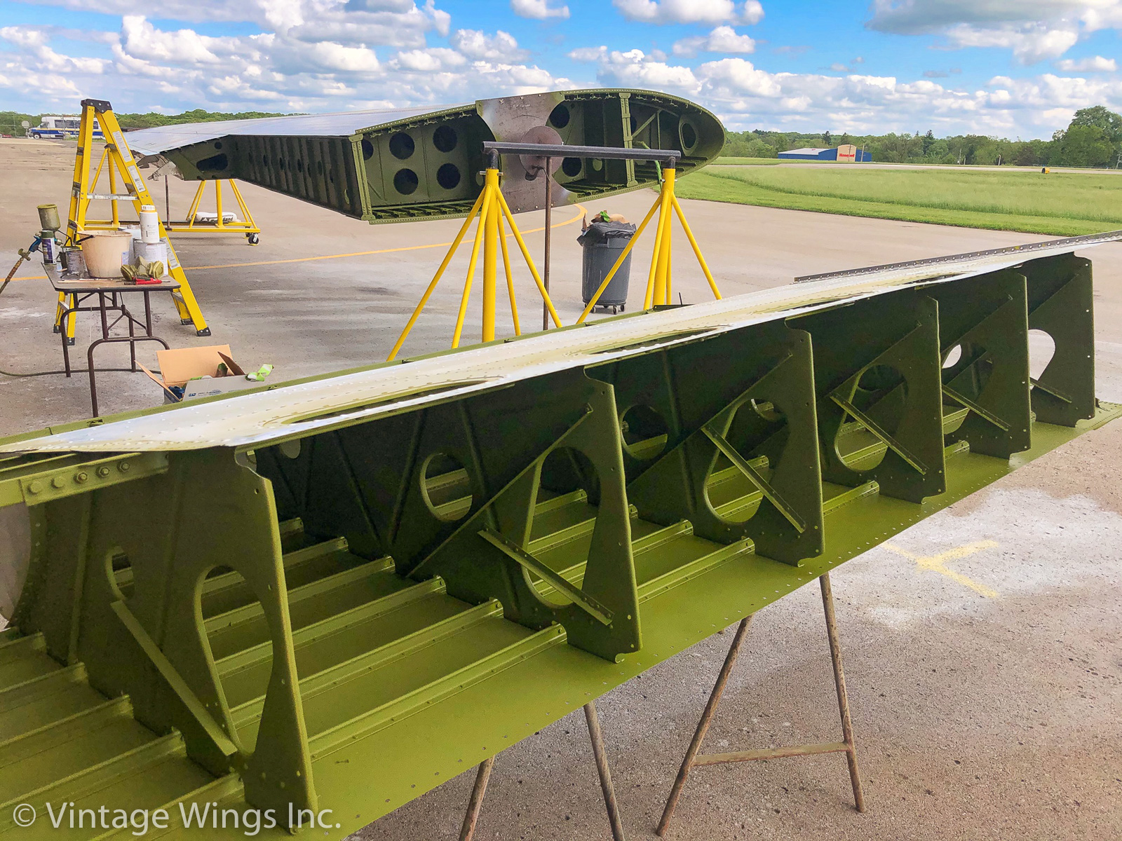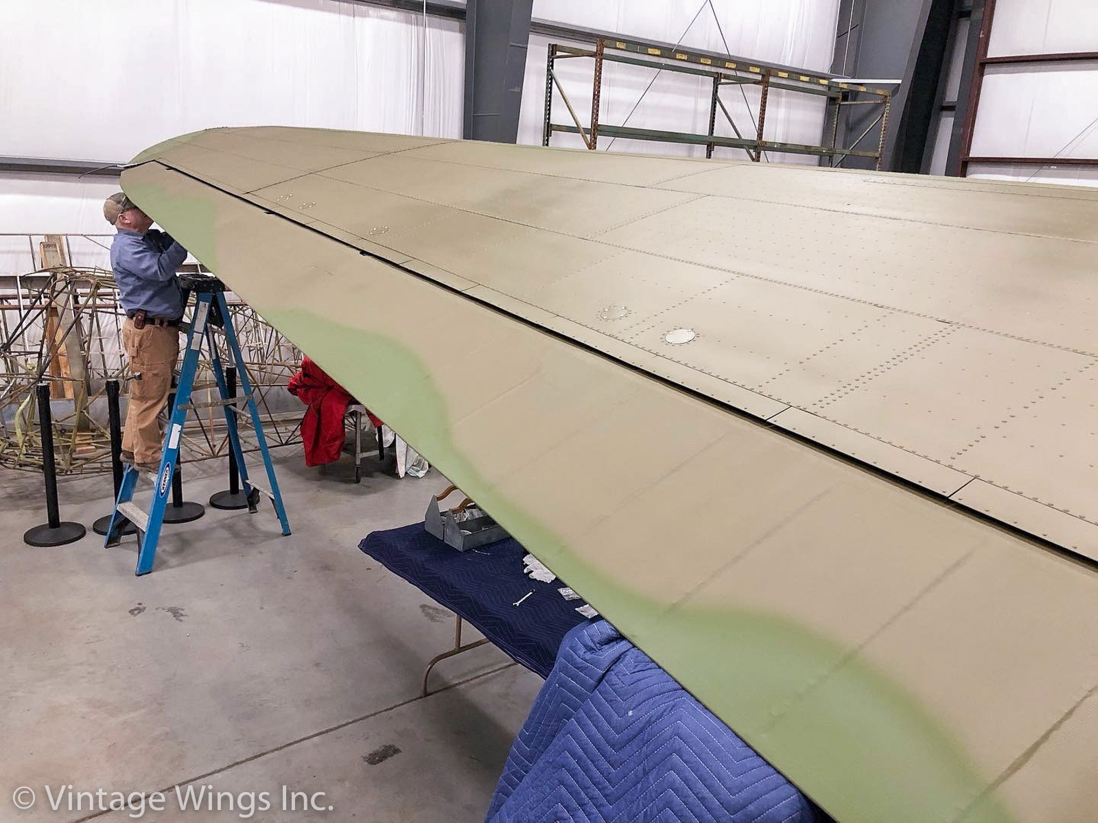Another large accomplishment was the repainting of the outer wings, vertical stabilizer, horizontal stabilizer and flight controls. As the winter months closed in on us in late fall, we had initially planned to paint the entire aircraft. However, with weather and temperatures working against us, we had to focus on painting just the areas which would allow us to continue working on the restoration through the winter and into early 2021. We also painted both wheel wells before the final installation of new wiring and fluid lines.