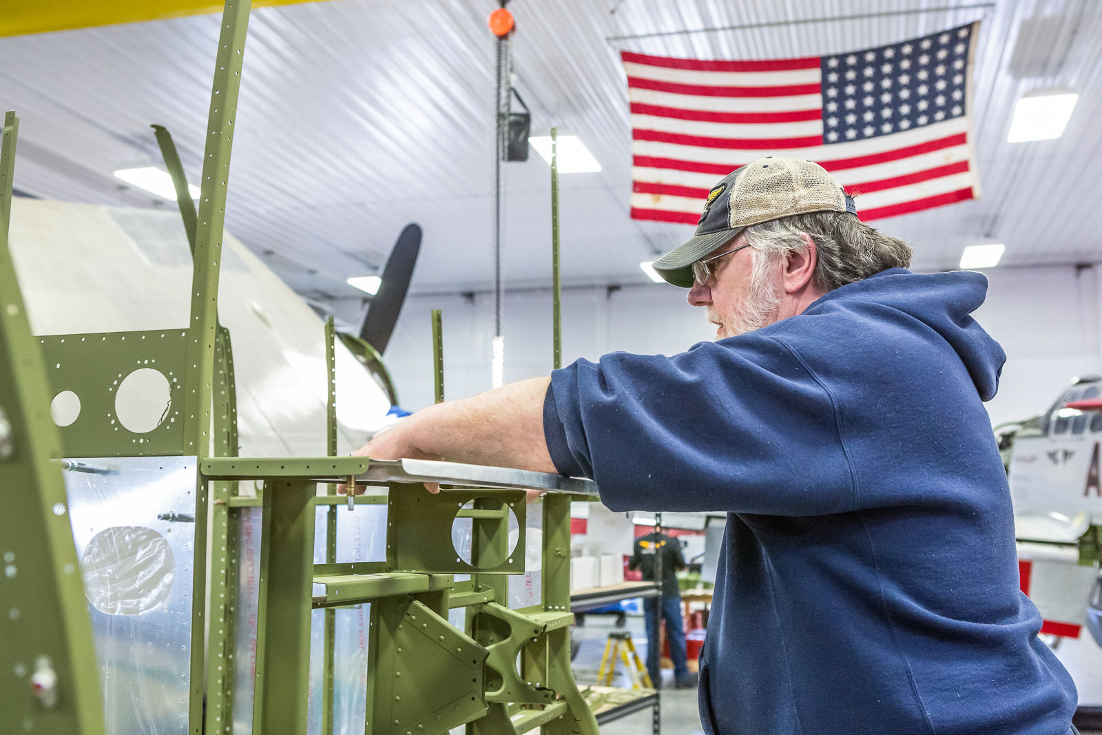 The AT-10 is built primarily of wood, but the fuselage from the rear of the cabin forward and the engine nacelles are metal structures. Those assemblies are in the first part of the restoration schedule.