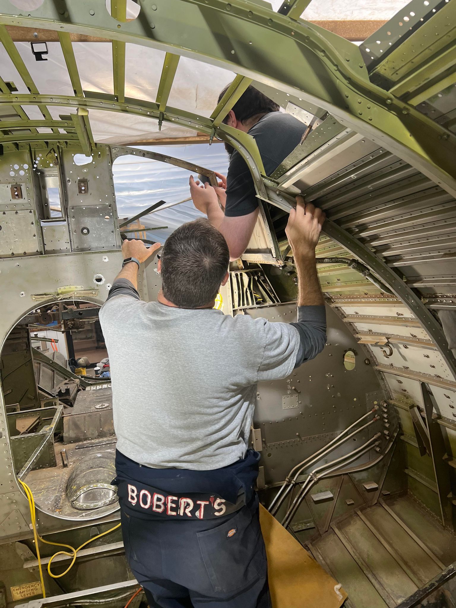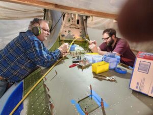 When Vintage Aviation News last updated readers on the restoration project in December 2022, the Squadron had completed new hangar doors to enclose their workshop, as well as major structural work on the aircraft’s center section, where its two Pratt & Whitney R-1830 radial engines are mounted. They had begun work on flight controls and the cockpit, reinstalled hydraulic and fuel lines and new wiring for the electrical systems, and were fundraising for an overhauled R-1830 engine. In December 2023, Vintage Aviation News Publisher & Founder Moreno Aguiari spoke to the Lake Superior Squadron’s Wing Leader, Bill McMahan, about their progress on this ambitious project. McMahan highlighted the efforts of Richard Kahoon, one of their volunteers, to restore the cockpit roof and windshield sections of the aircraft that were damaged in the aforementioned 1998 wind storm. “That’s a little bit of a puzzle,” McMahan notes. From there, they moved forward to the cockpit and nose section, with the goal of restoring the PBY’s combat turret, which had been modified to an enclosed nose during BuNo. 64097’s subsequent civilian service. “We have to fabricate everything there from scratch from the plans,” McMahan says.