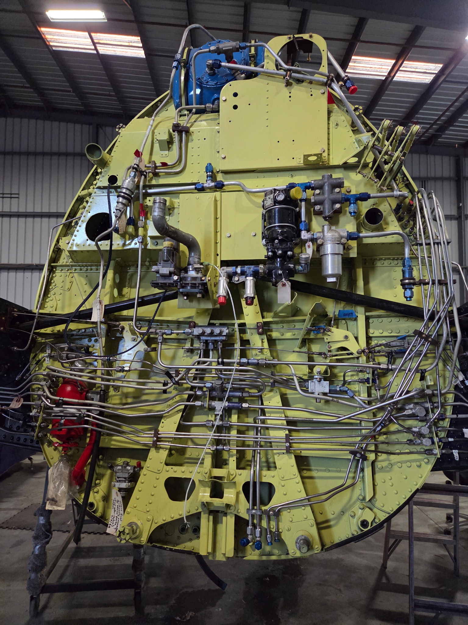 The team is currently preparing the Bearcat’s Pratt & Whitney R-2800 engine. “The engine is mounted with all associated components, including the cowl ring, cowl flaps, and oil coolers,” McMahon explained. “We’re building all new hoses—oil, fuel, and sense lines—and we’re about 50% complete with that work. The cowl ring and nose bowl were in poor condition, but repairs are now finished and painting of the nose bowl is pending. We expect an engine run by the end of this year, possibly sooner.”
