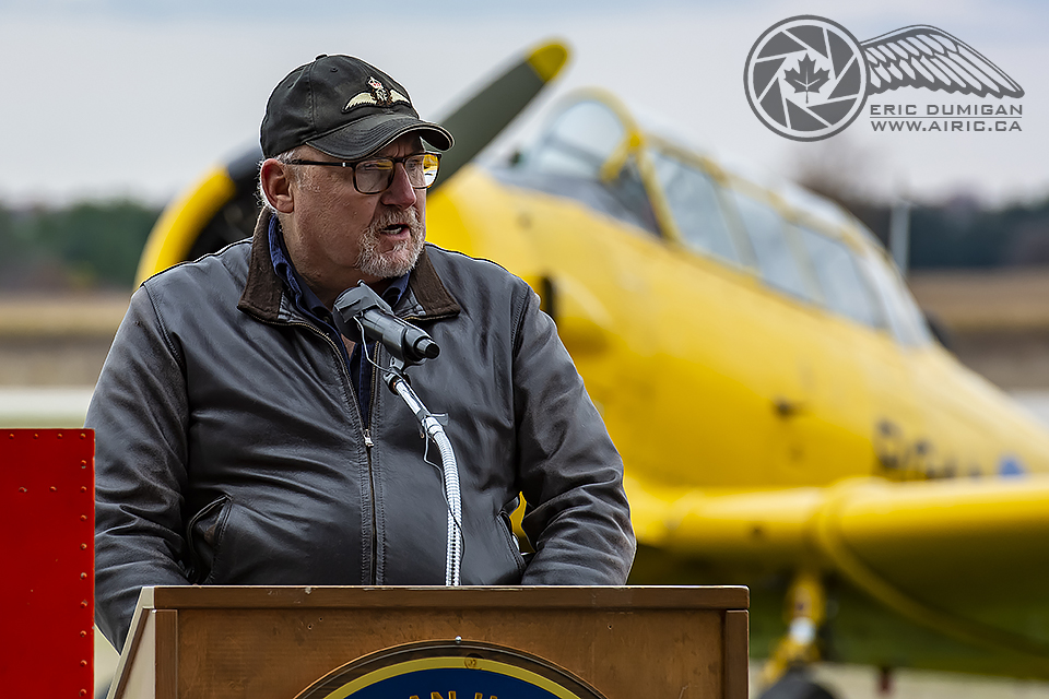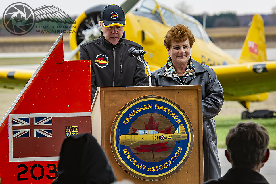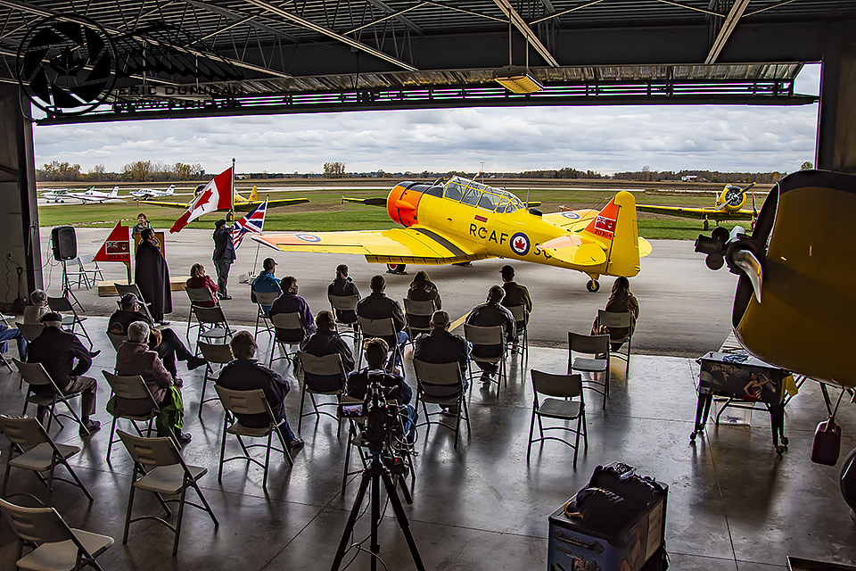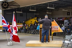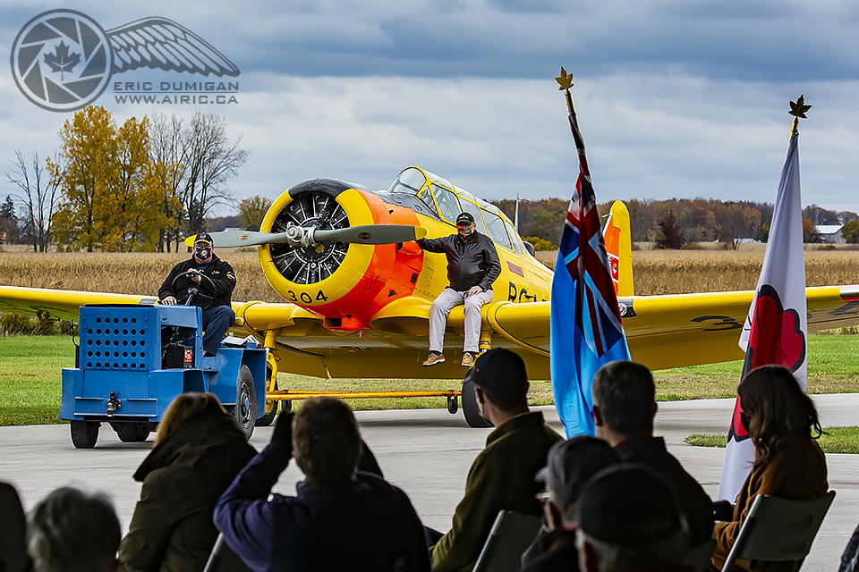As already noted, 20304 had remained virtually untouched since her RCAF retirement, so she arrived at the CHAA in virtually time-capsule condition. The CHAA documented all of the airframe’s markings before stripping her down to the smallest component. For over ten years, CHAA’s volunteers have worked on returning the Harvard to her former glory, and wearing the same markings she wore upon her retirement at RCAF Station Centralia. This past October 25th, with members of the Dressel and Tyrell family in attendance, 20304 rolled out from CHAA’s hangar to the sound of the RCAF March Past. CHAA dedicated her to Gilbert Dressel, Stanley Tyrell and Gregory Tyrell. In a touching moment, Reverend Bill White from Legion #501 in Lambeth had everyone present place their hands upon the aircraft while he blessed it.