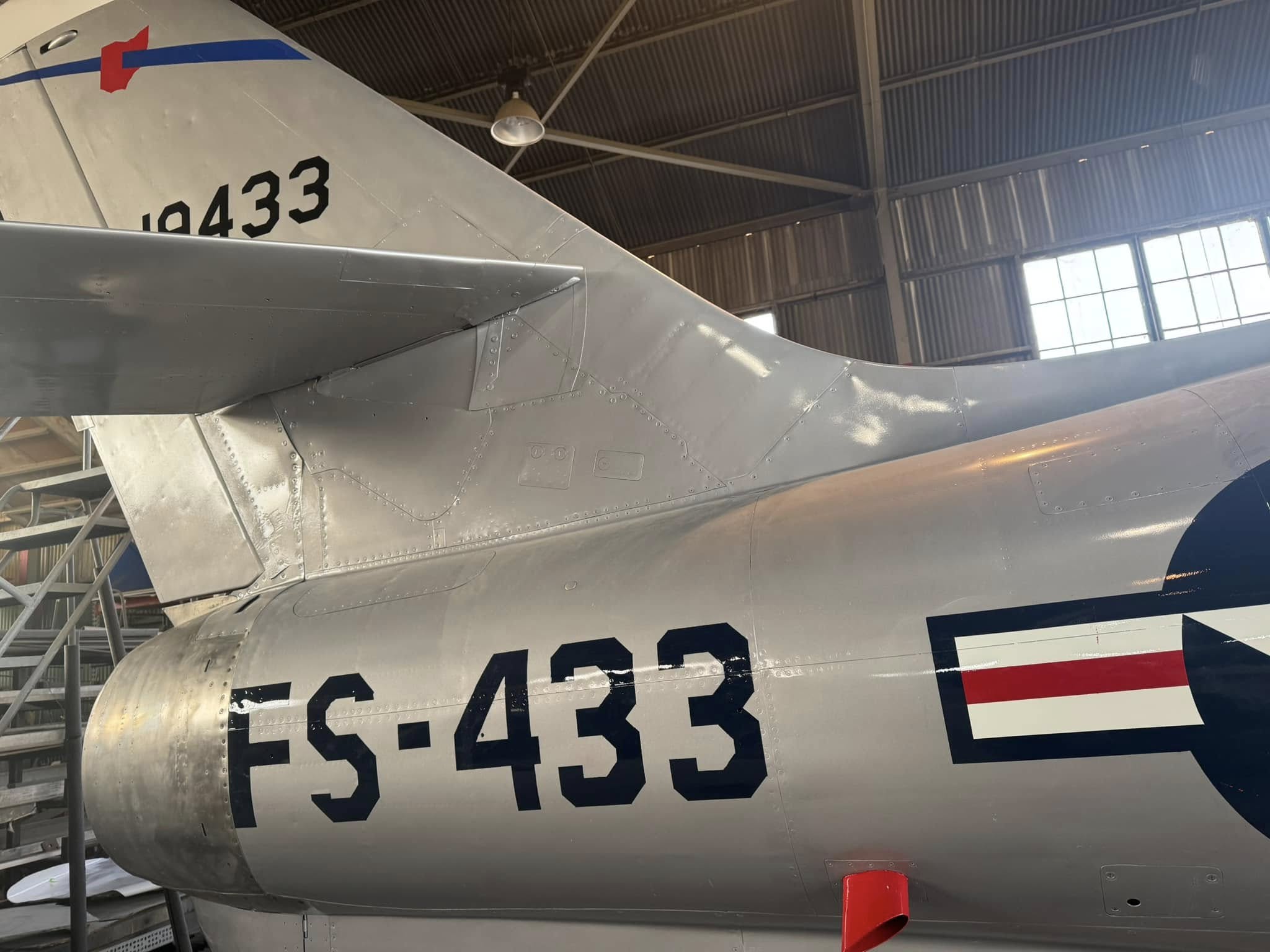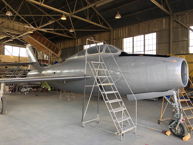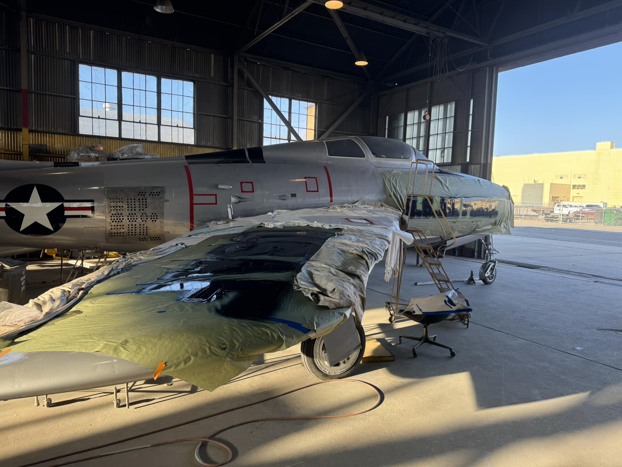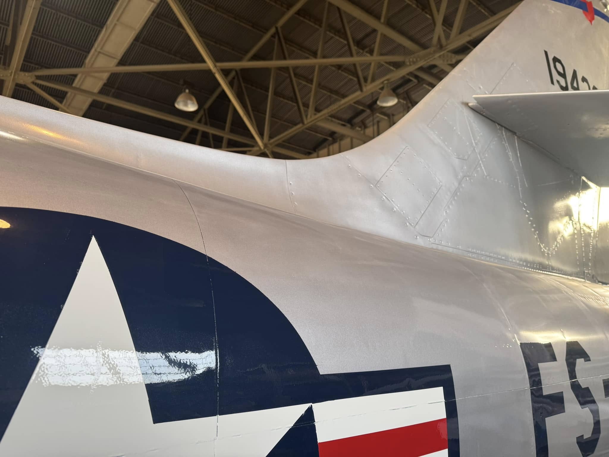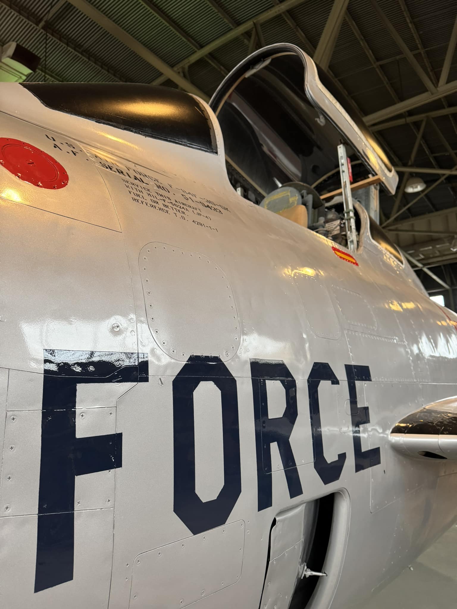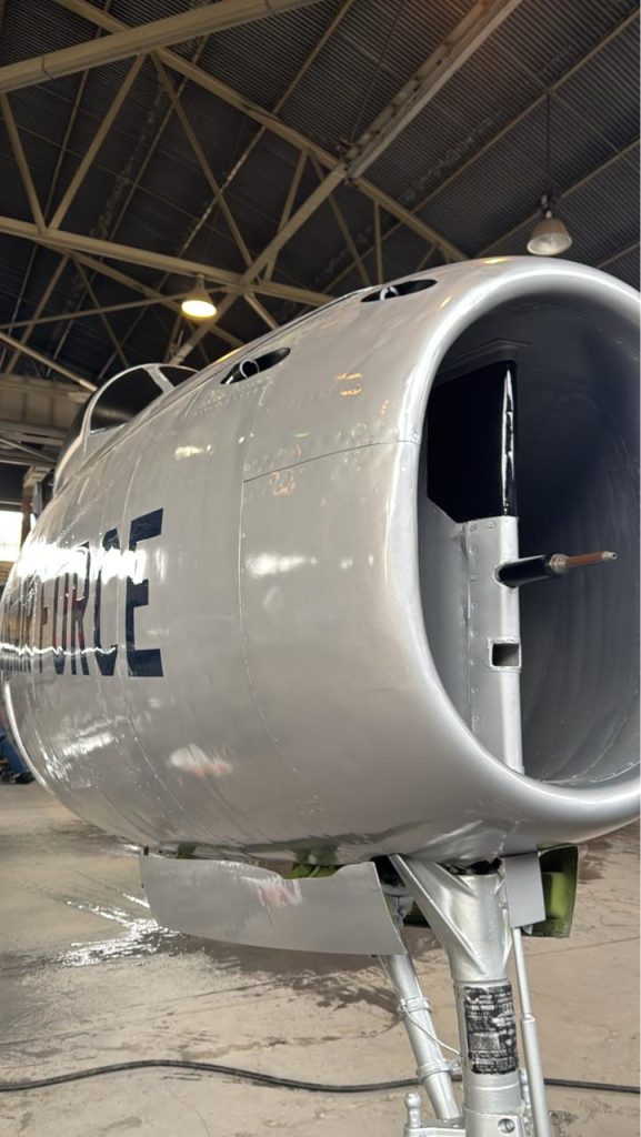 At Castle, the Thunderstreak was painted in its 12th SFW colors, but being one of the many planes on display outdoors, the colors faded over time, and its exposure to the elements took a toll on the structure of the aircraft. As a result, museum restoration specialists, led by Greg Stathatos, towed the F-84F to the museum’s restoration hangar for a refurbishment on May 24. Over the summer and fall, the aircraft has been refurbished and repainted to reflect the livery it wore during the Berlin Crisis, standing guard as a Cold War Warrior.