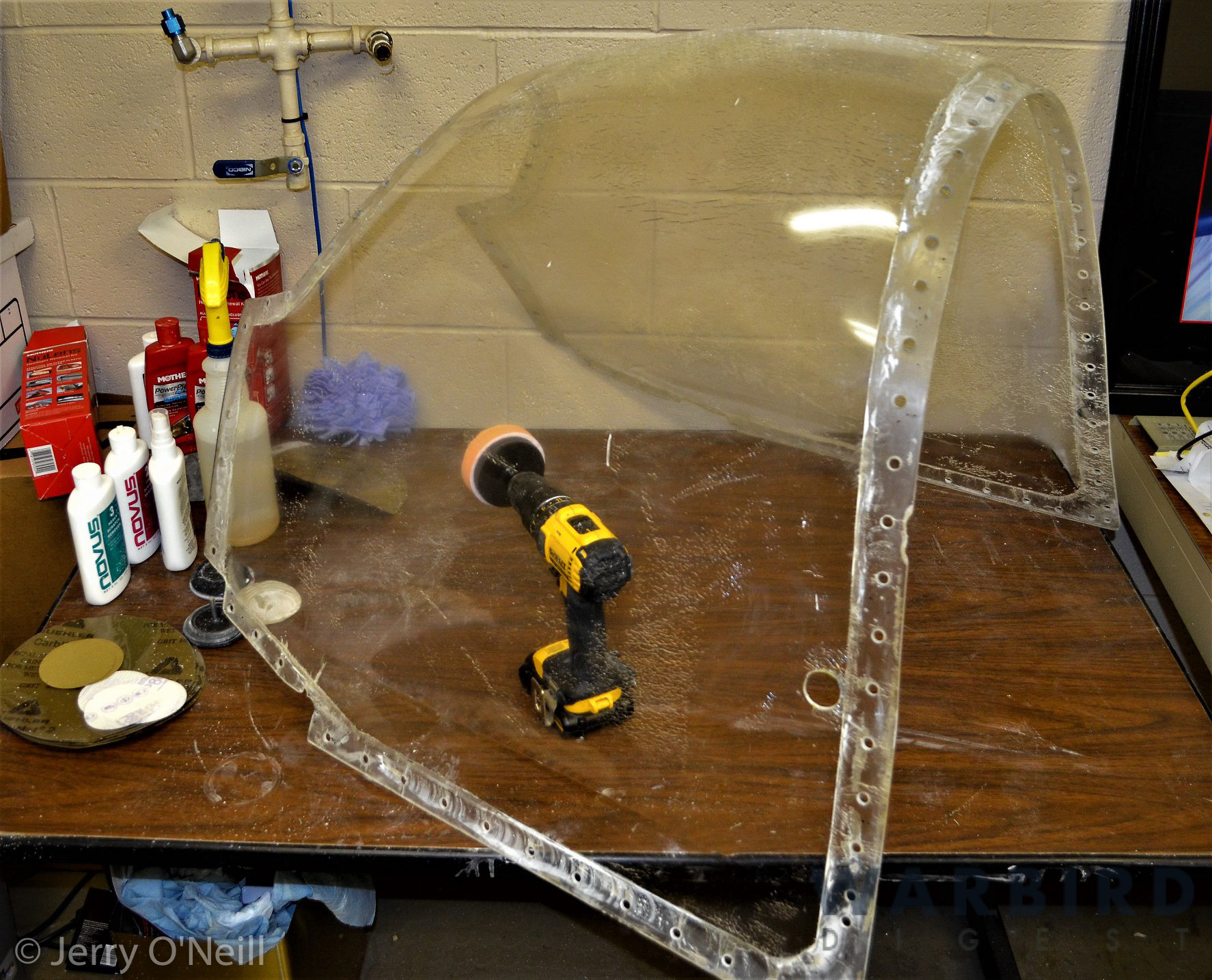 The donation of a non-airworthy Plexiglas canopy was a welcome gift. CASC volunteer Ed McGuiness is slowly polishing it so that it can eventually be fitted to the existing canopy frame.