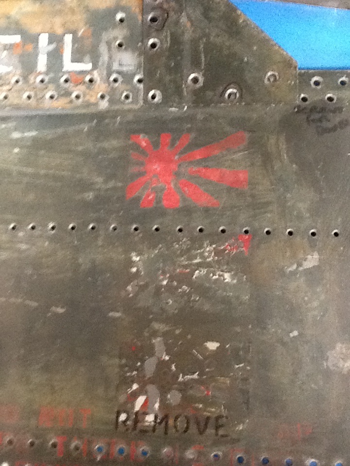 Includes many original parts comprising original wreckage broken/damaged fuselage pieces, rear fuselage section with horizontal stabilizer; all with original paint and many parts in situ. Three Japanese kill flags visible on cockpit side wall.