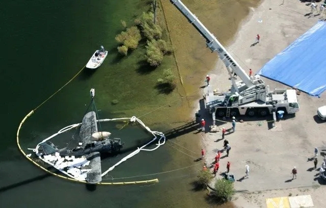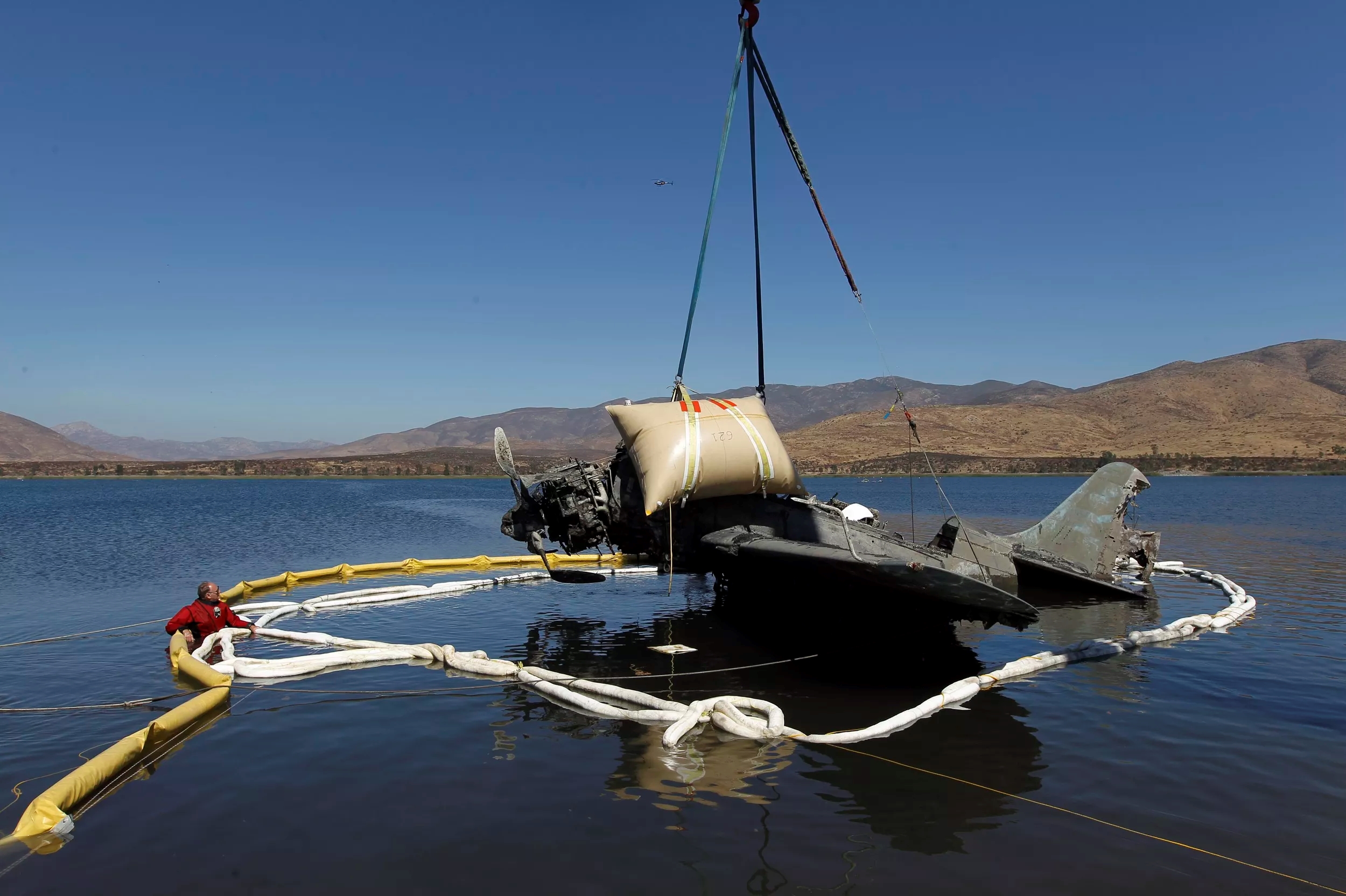 Between August 17 and 20, 2010, A & T Recovery divers worked to recover the Helldiver, resting 90 feet below the reservoir’s surface and with the lower section deep in the mud. The recovery also involved local environmental professionals who took precautions to ensure that the fuel, oil, and hydraulic fluid would not leak from the airplane and contaminate the reservoir’s supply of drinking water for the city of San Diego. Additionally, the team had to remove the layers of mud and sediment that had built up inside the plane to lessen the strain on the aircraft’s structure during its gradual rise to the surface. After working for three days to extract the aircraft from the bottom and remove as much sediment as possible while underwater, the Helldiver was brought to the reservoir’s surface on August 20, and the Helldiver was lowered near the boat dock off Wueste Road, where the aircraft’s engine, supported only by its lower mounts, was removed and placed beside it. Additionally, much of the aircraft’s canopy was removed and brought to shore before the rest of the aircraft, and several loose artifacts were also carefully removed, including the original parachute discarded by Frazar when he swam from the sinking plane 65 years prior.