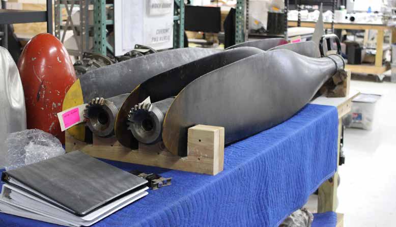 This month, propeller components were inspected for possible overhaul and use in the P-47 project. Wing assembly continued with work on the leading edges and ammunition boxes. Drop tank/bomb release cables and a vent for the main fuel tank were installed in the fuselage.