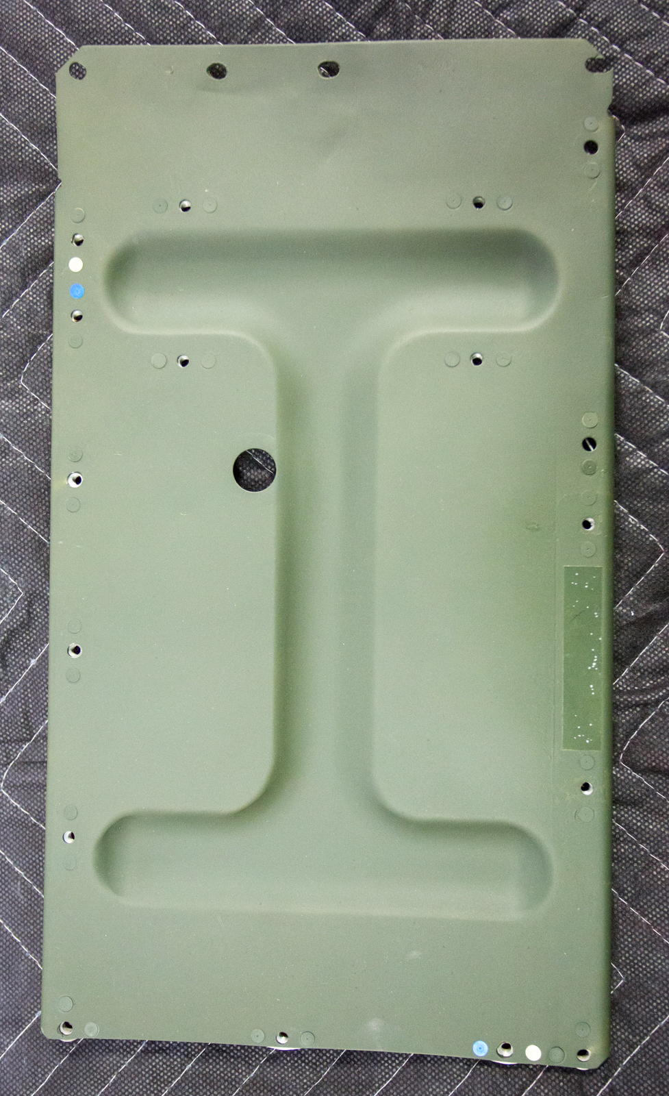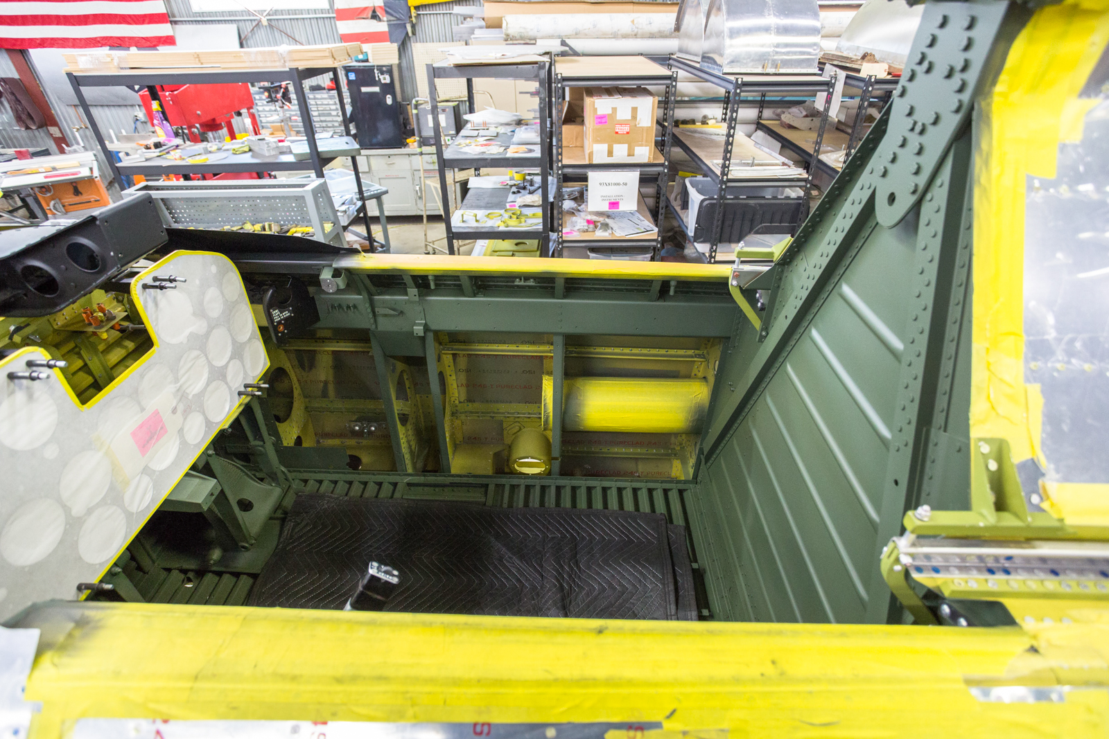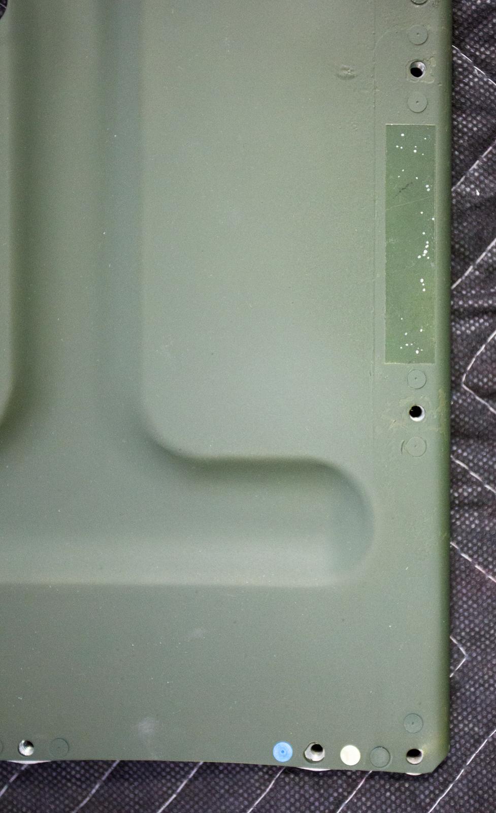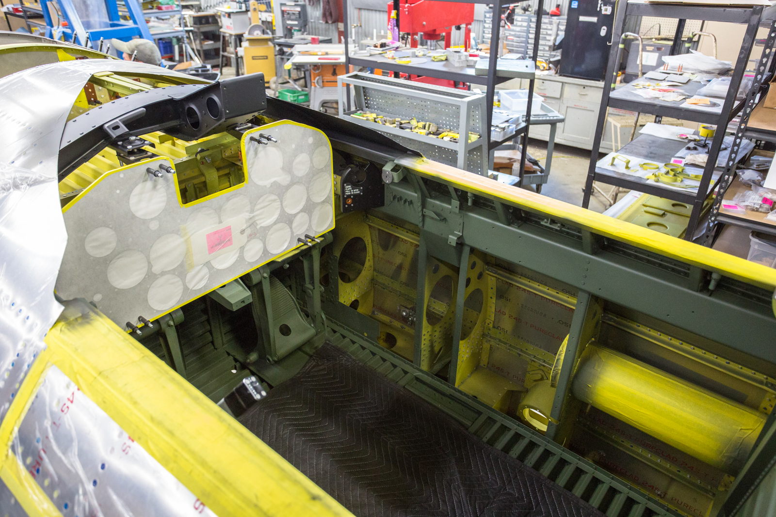 The undisturbed paint is on part number 93F83057-6. It is the lower right front cockpit wall, original to our airframe, 42-27609. The panel’s importance lies in the paint along the edges.