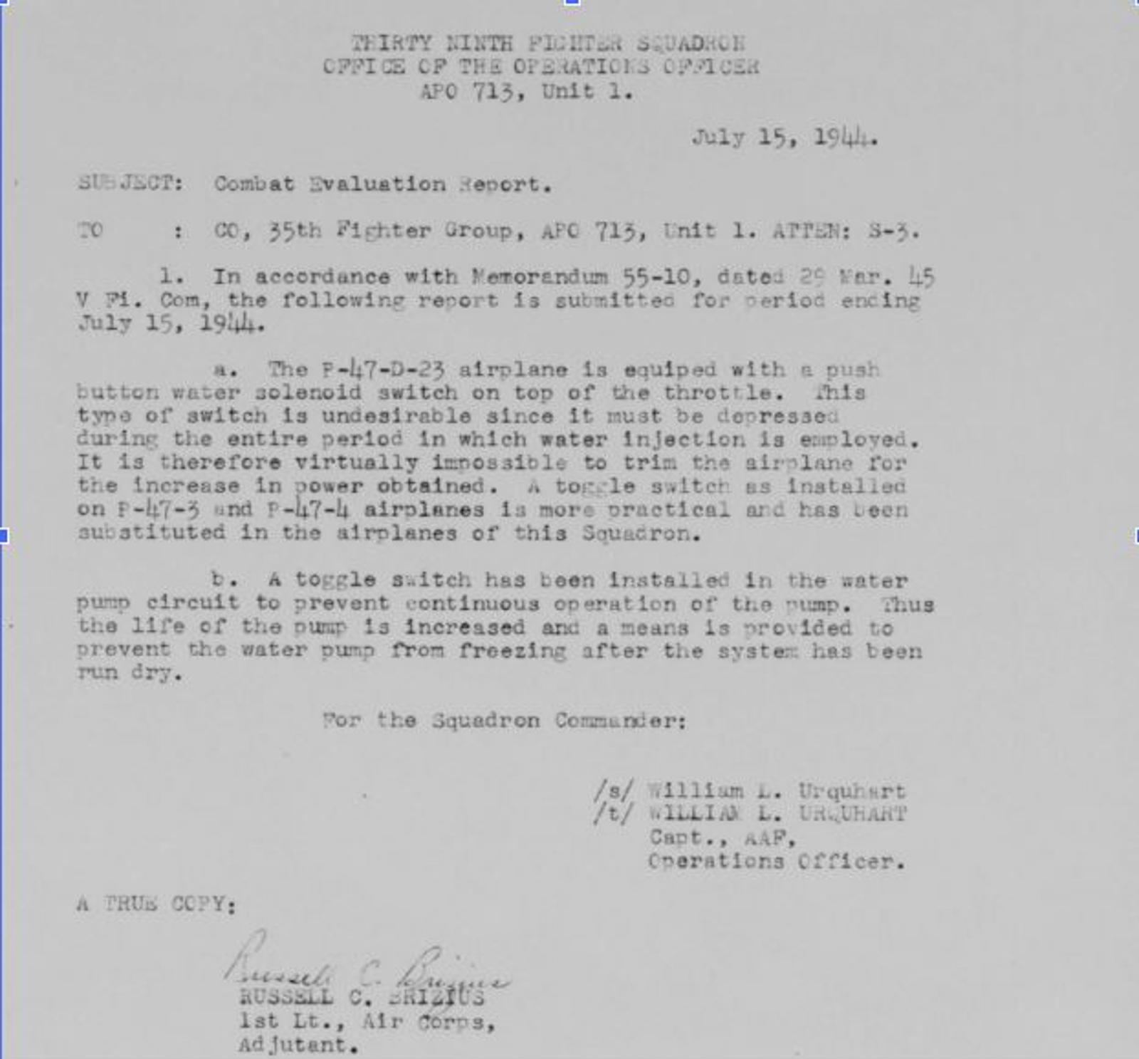The 35th group didn’t like that arrangement because with one hand on the stick, and the other on the throttle to hold down the water injection switch button, “it is virtually impossible to trim the airplane for the increase in power obtained”.