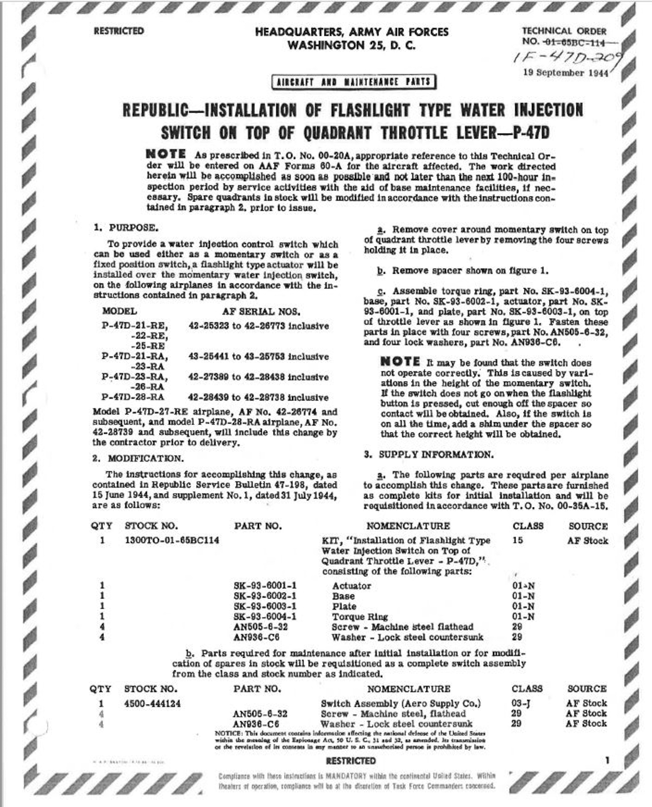 Republic issued Tech order 01-65BC-114 to remedy the water injection control issue on subsequent P-47s. For utility reasons, the updated flashlight-type switch specified in the Tech Order is what will be used on 42-27609.