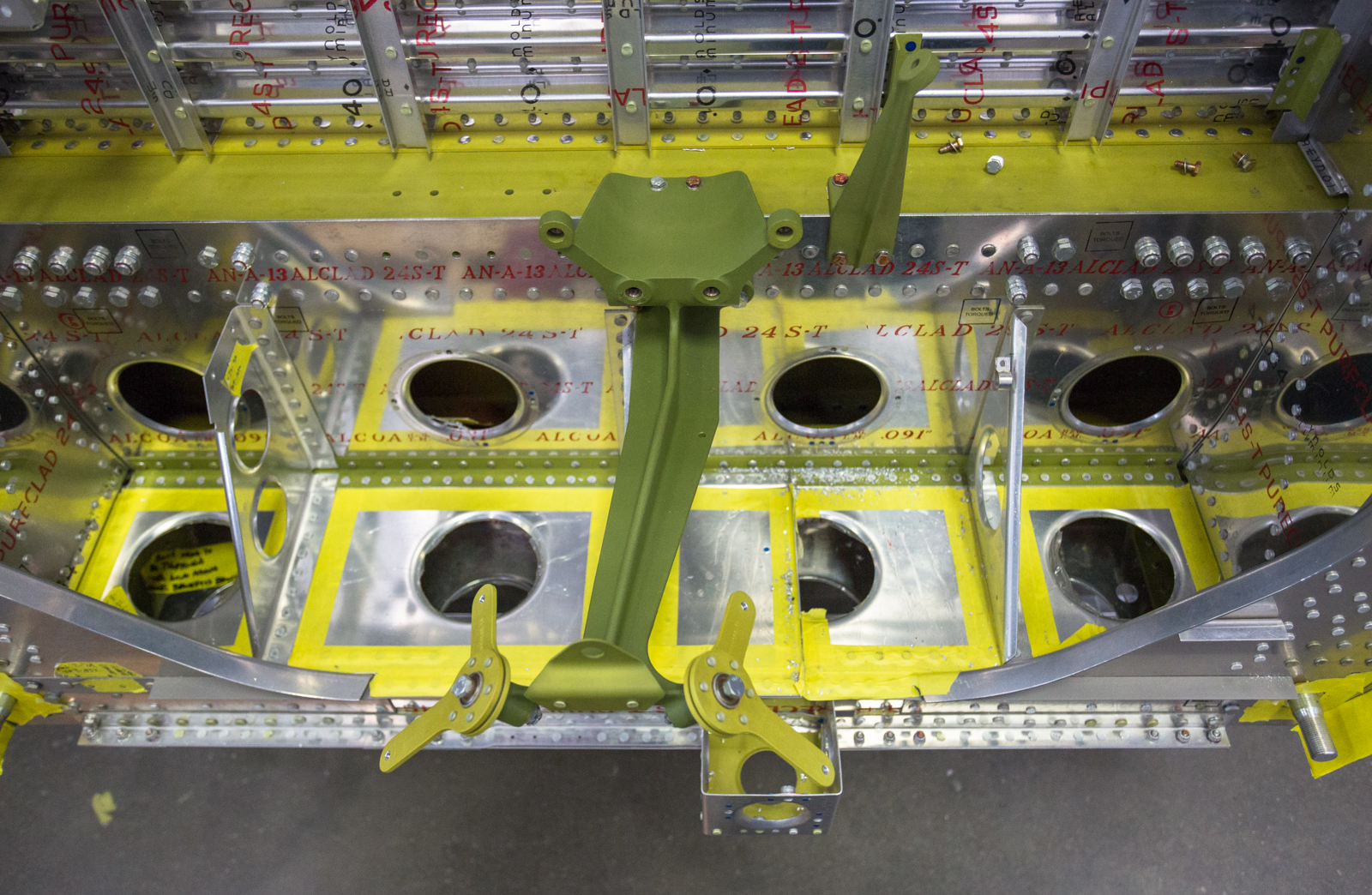 One of the challenges in an accurate restoration of a veteran warbird is getting the paint colors right for that specific airplane. Color standards are a start, but they aren’t the whole story. The inside of the cockpit on 42-27609 fortunately had a small area of undisturbed paint that had been covered by overlapping parts. It was fortunate because that paint didn’t precisely match the color specification called out in the engineering drawings.