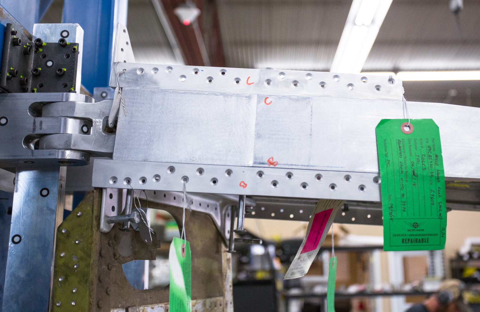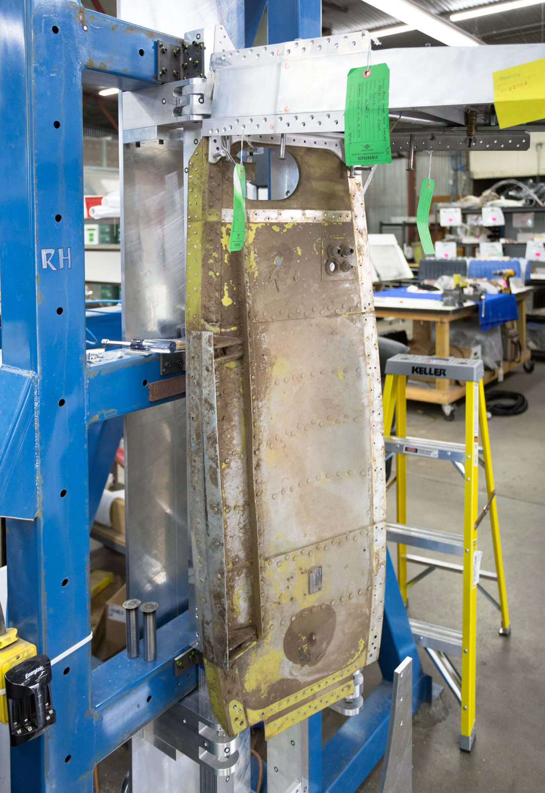 An original rib is in place to verify if the rivet holes line up (it will be removed later). The angles on each side of the spar, and the part running from the top to bottom along the base of the spar, called the “ fitting assembly rib 26 ¾ and spar” ; are original parts that were extensively examined, tested and found to be airworthy.