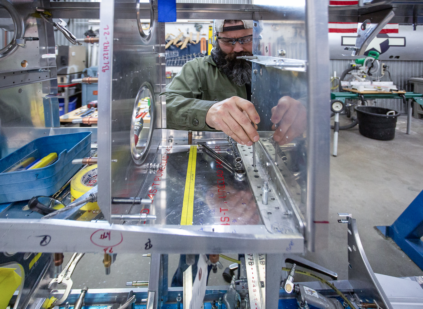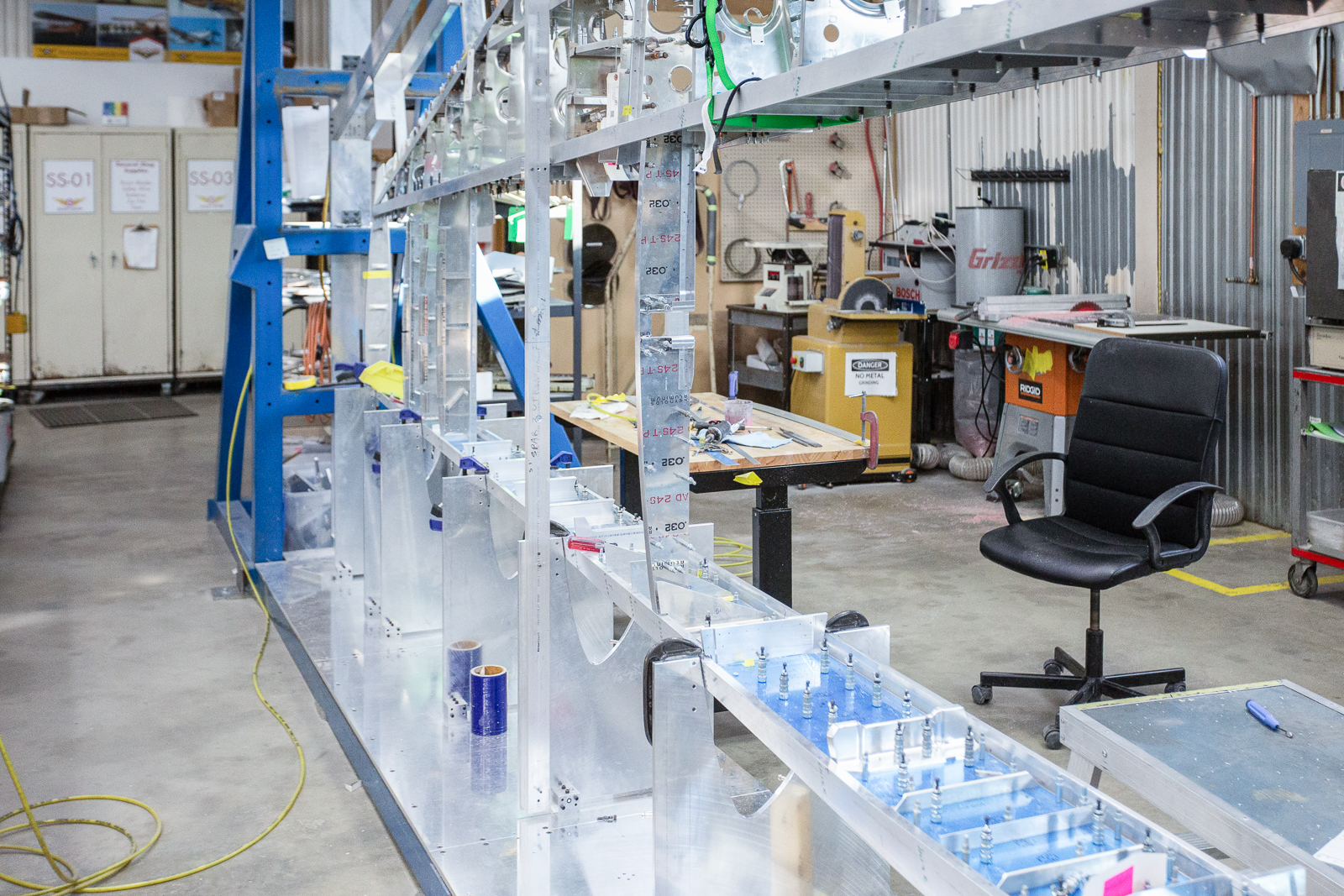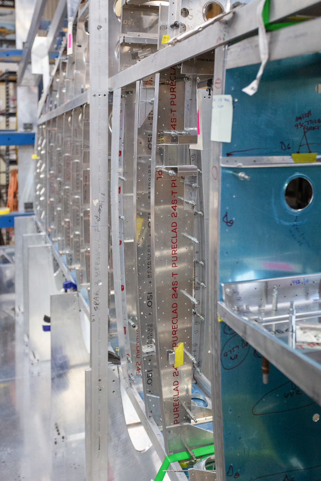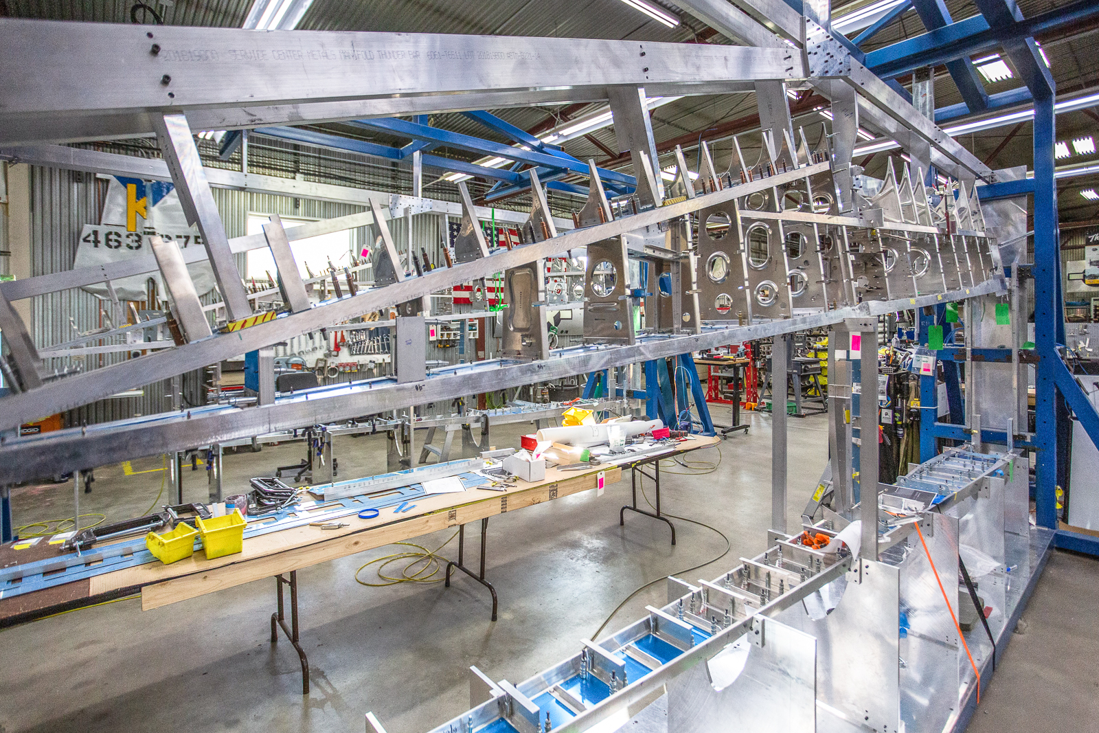 The complex wings of the P-47 require hundreds of parts, and almost every one of these are unique in shape and size. Duplicate parts are only found in a mirrored layout of the opposite wing. The fabrication guys have to work rapidly to keep up with the progress of the wing assembly.