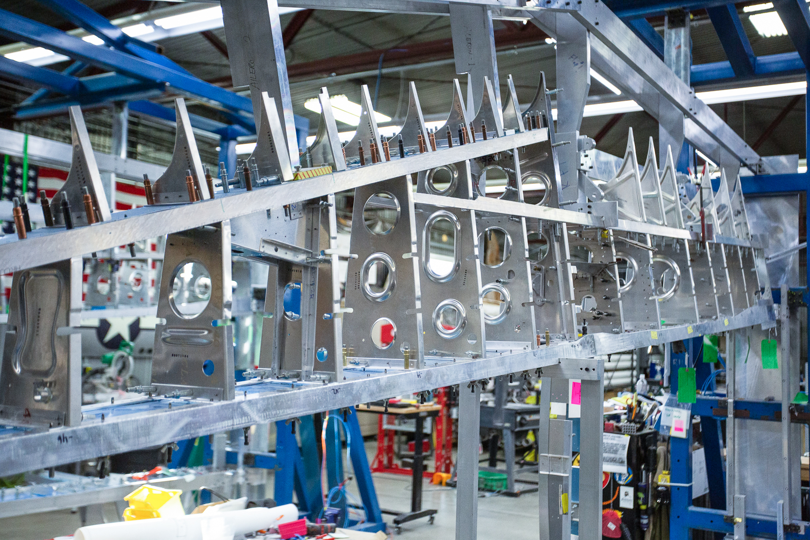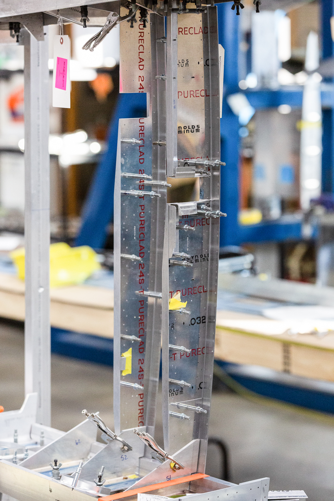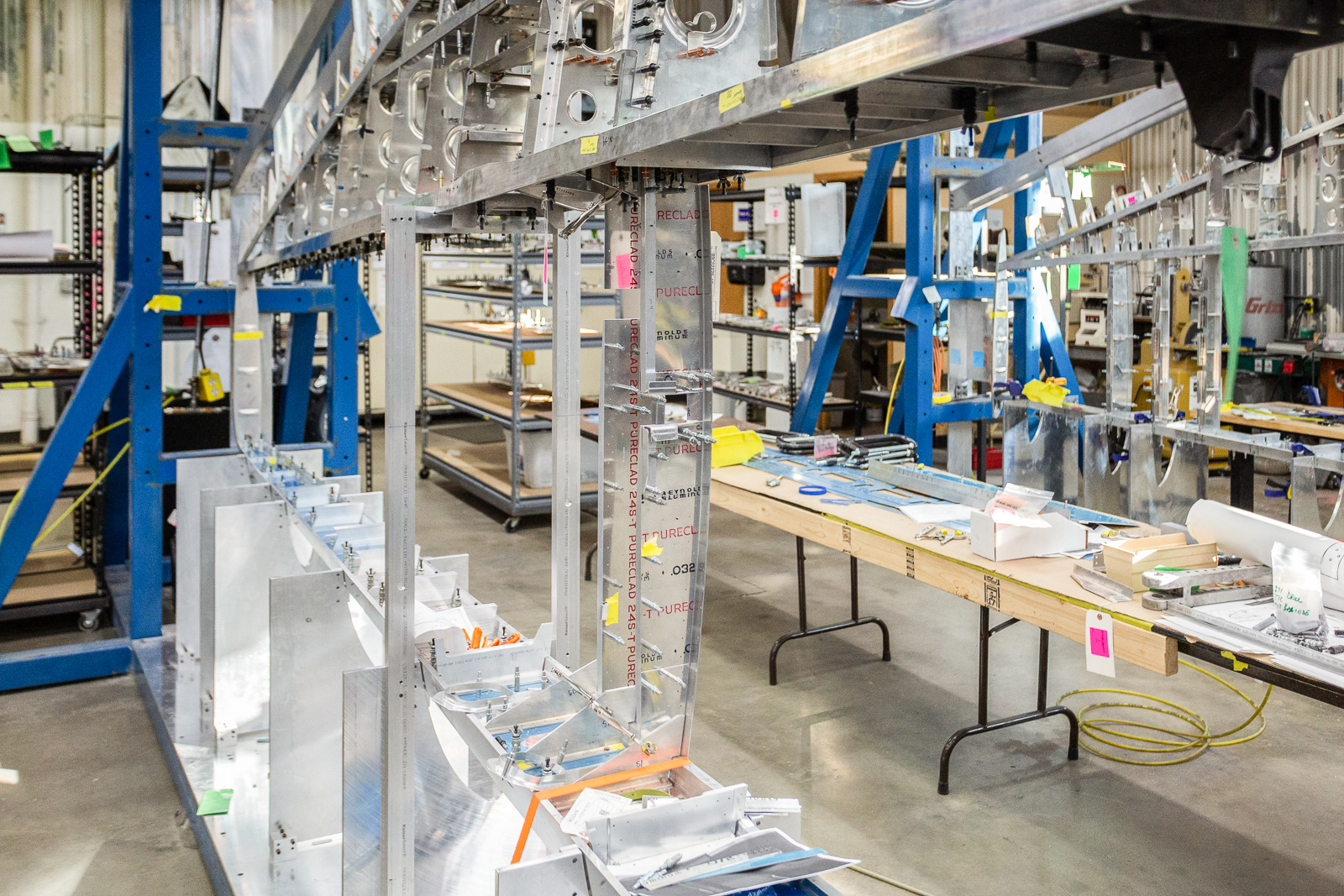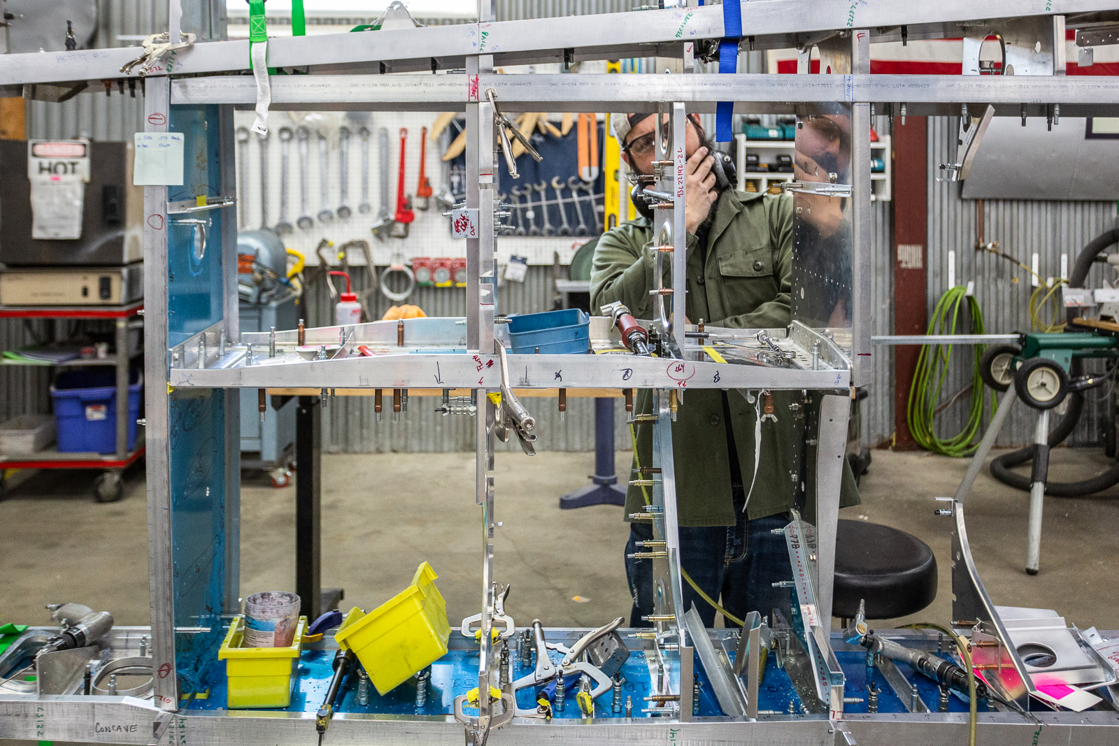 The complex wings of the P-47 require hundreds of parts, and almost every one of these are unique in shape and size. Duplicate parts are only found in a mirrored layout of the opposite wing. The fabrication guys have to work rapidly to keep up with the progress of the wing assembly.