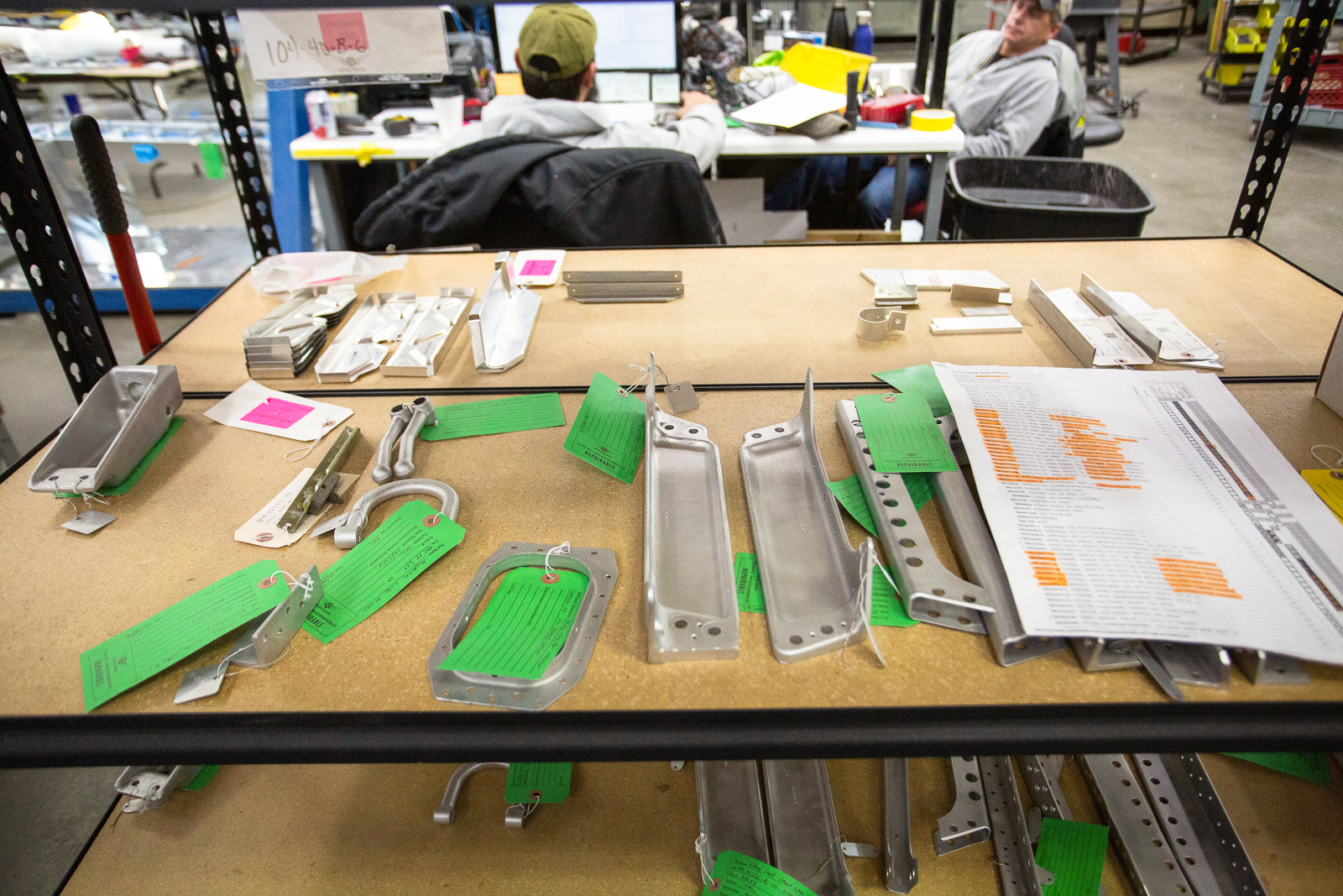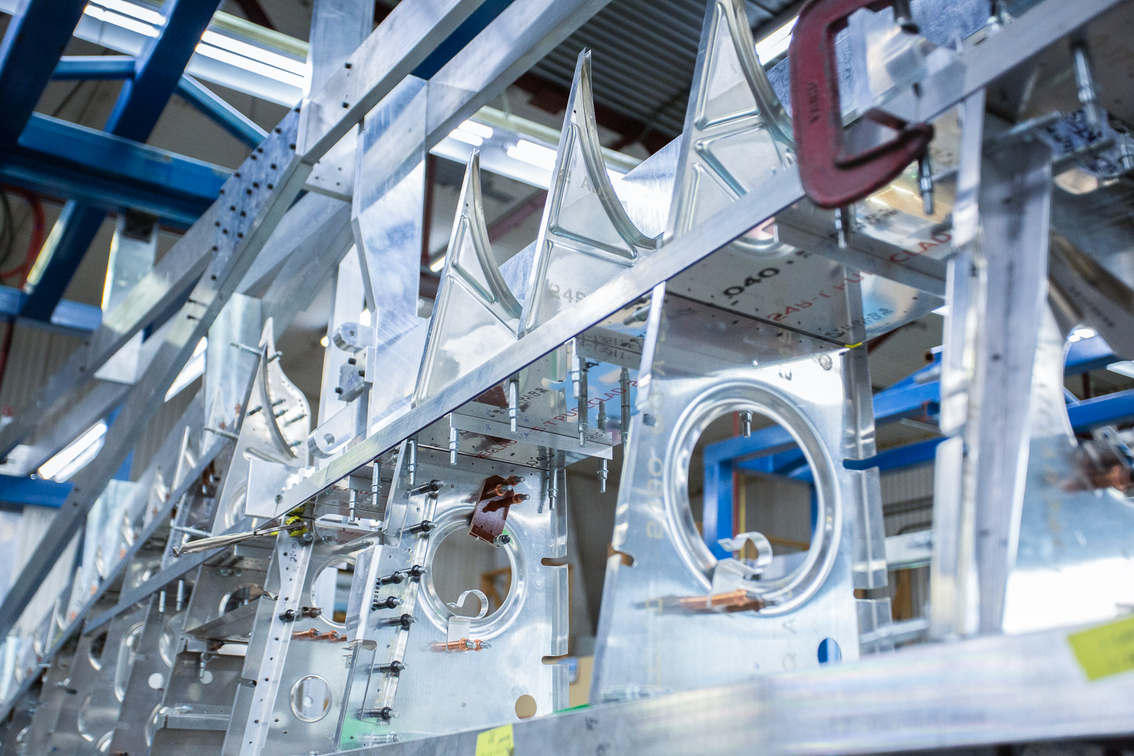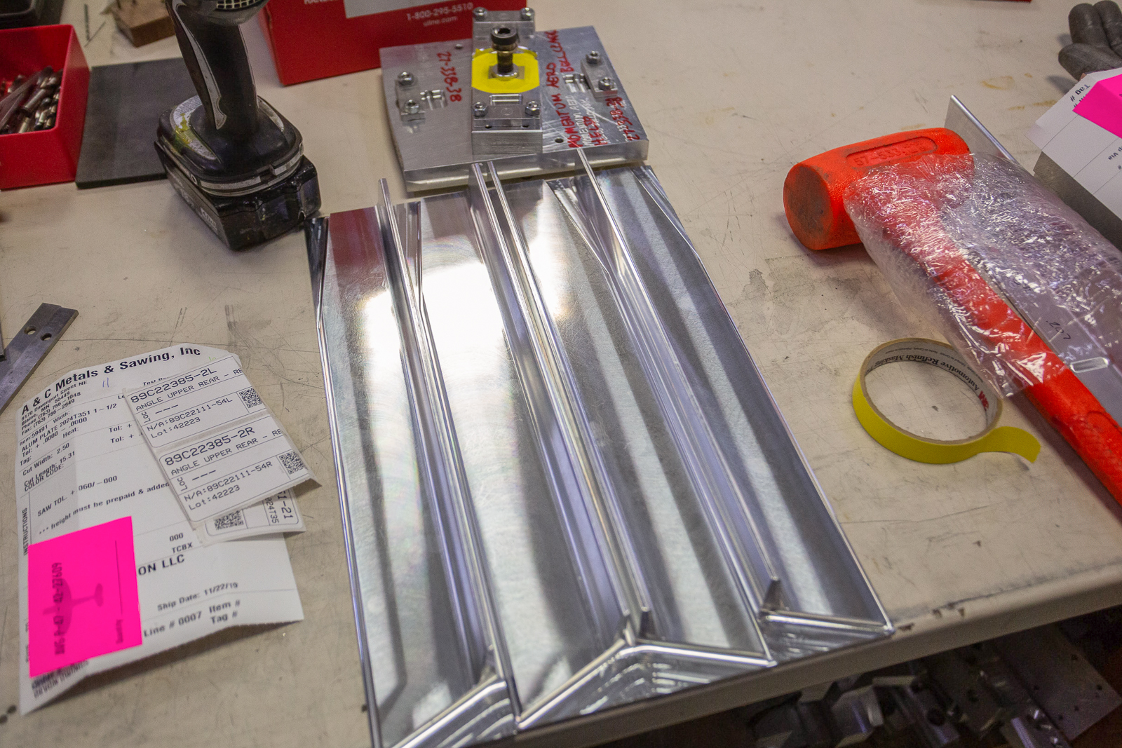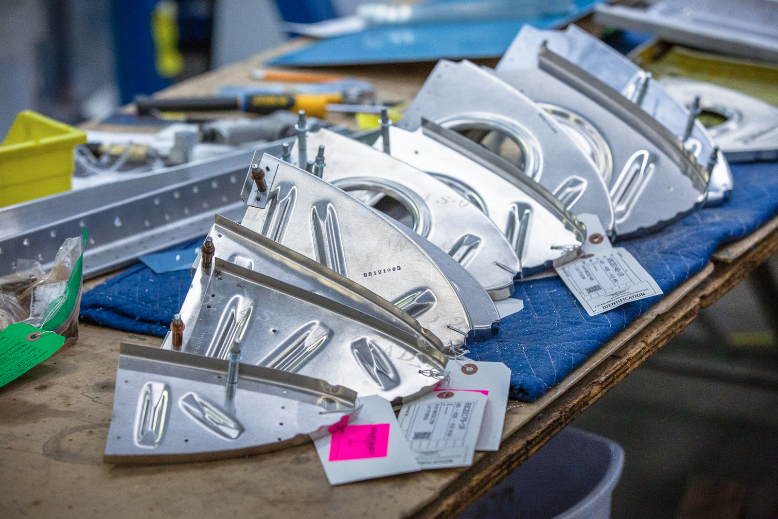 The complex wings of the P-47 require hundreds of parts, and almost every one of these are unique in shape and size. Duplicate parts are only found in a mirrored layout of the opposite wing. The fabrication guys have to work rapidly to keep up with the progress of the wing assembly.
