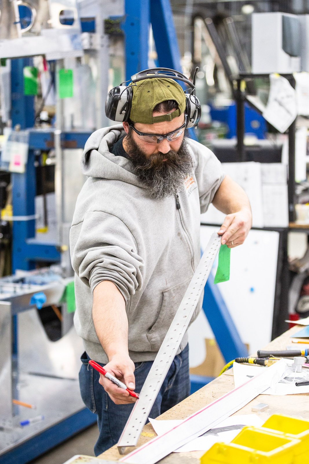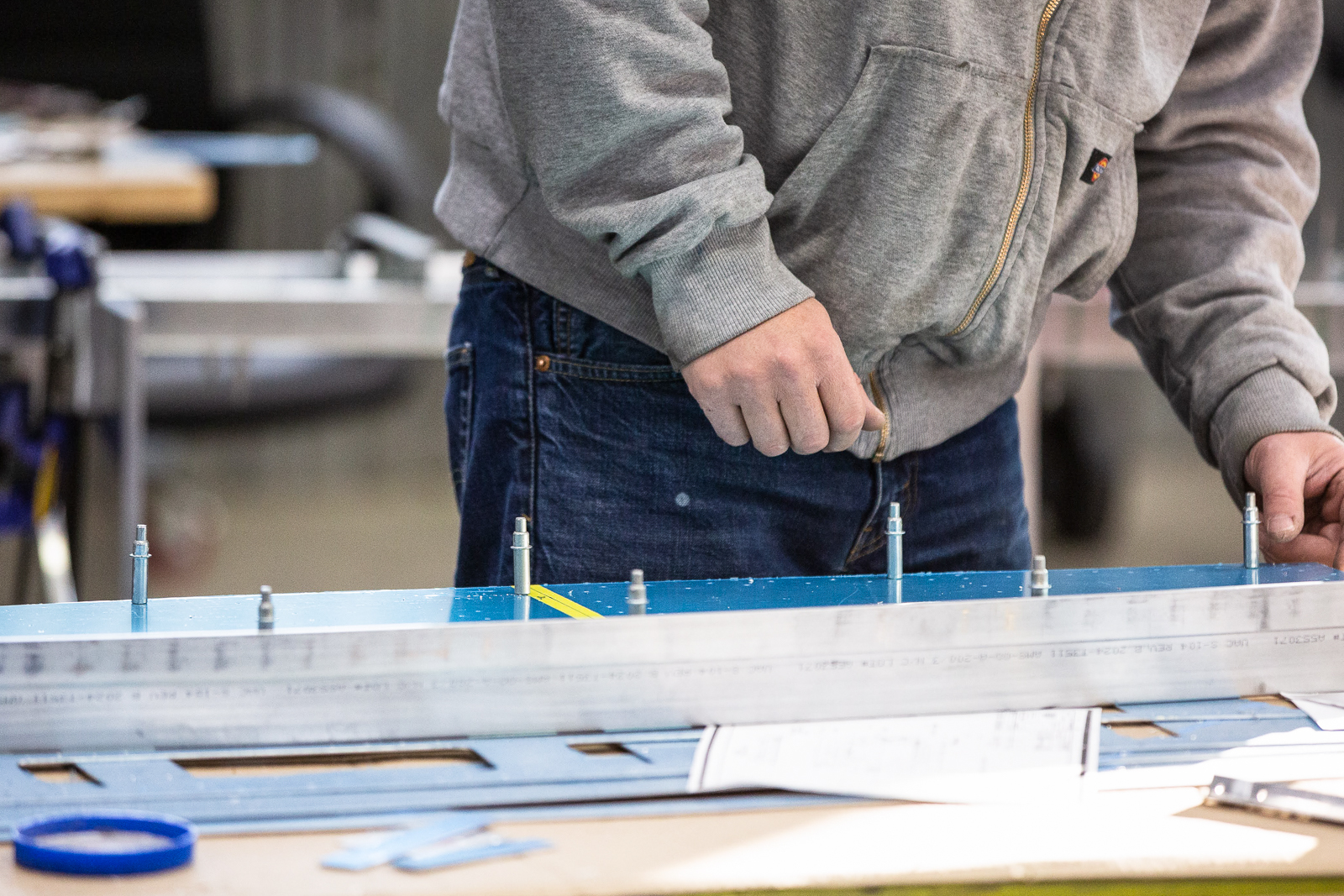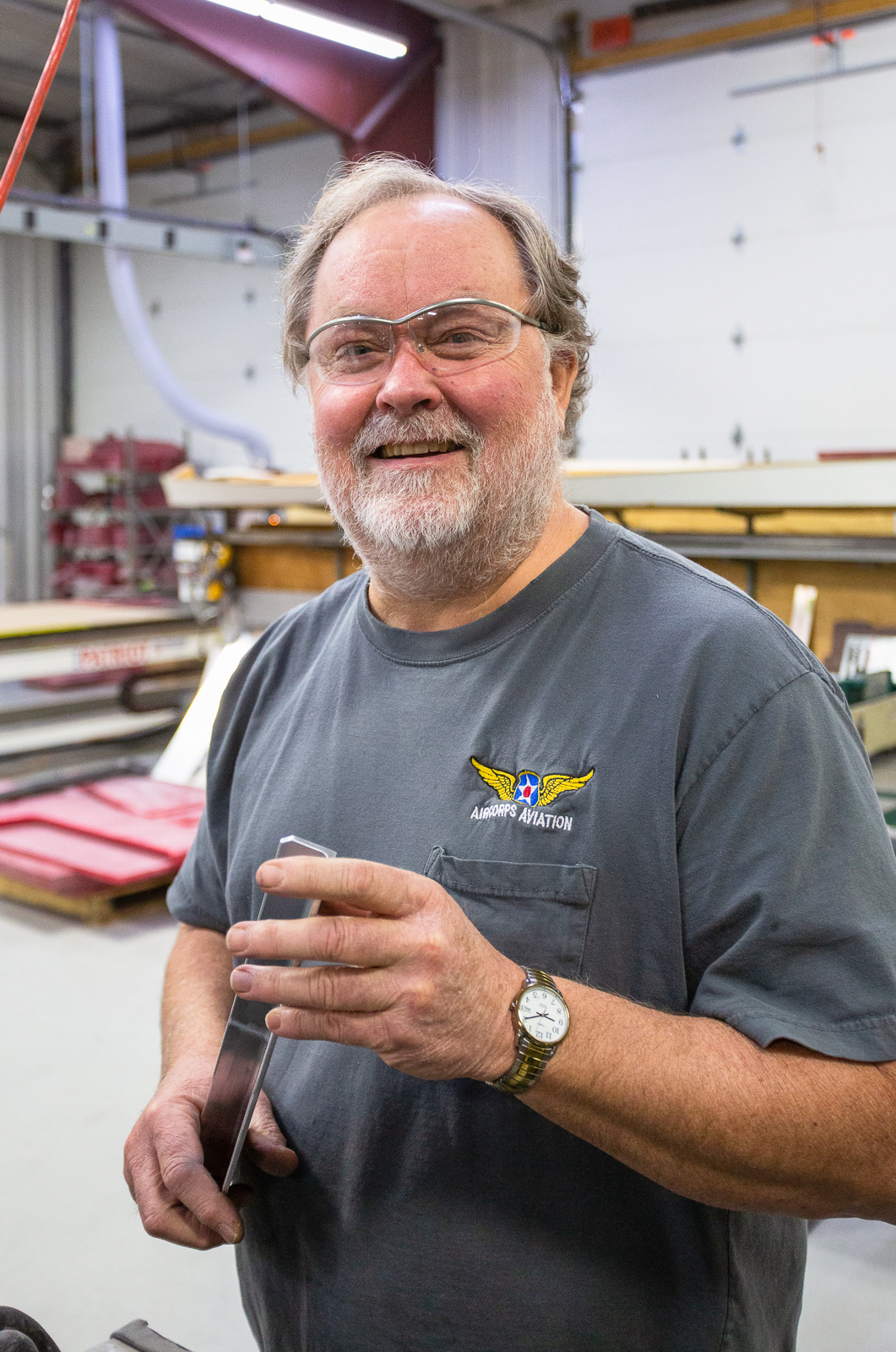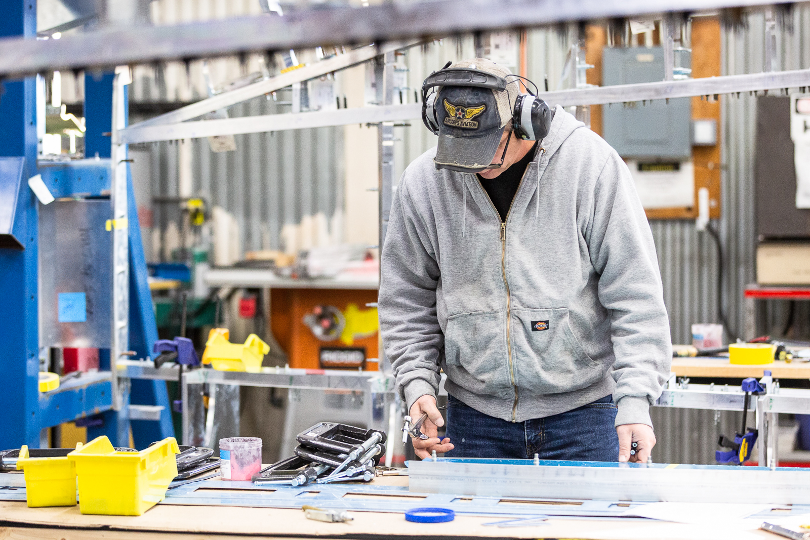 The complex wings of the P-47 require hundreds of parts, and almost every one of these are unique in shape and size. Duplicate parts are only found in a mirrored layout of the opposite wing. The fabrication guys have to work rapidly to keep up with the progress of the wing assembly.