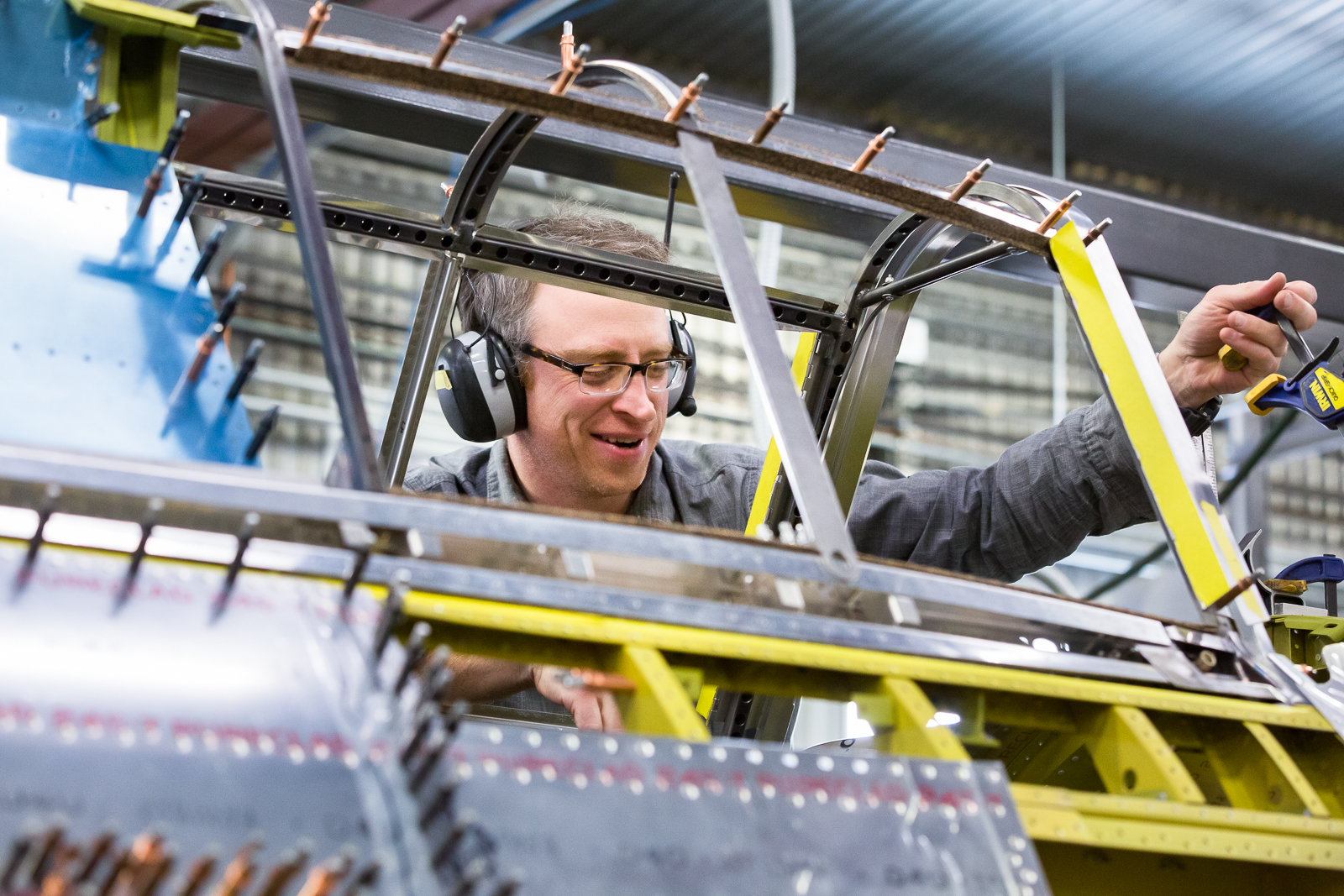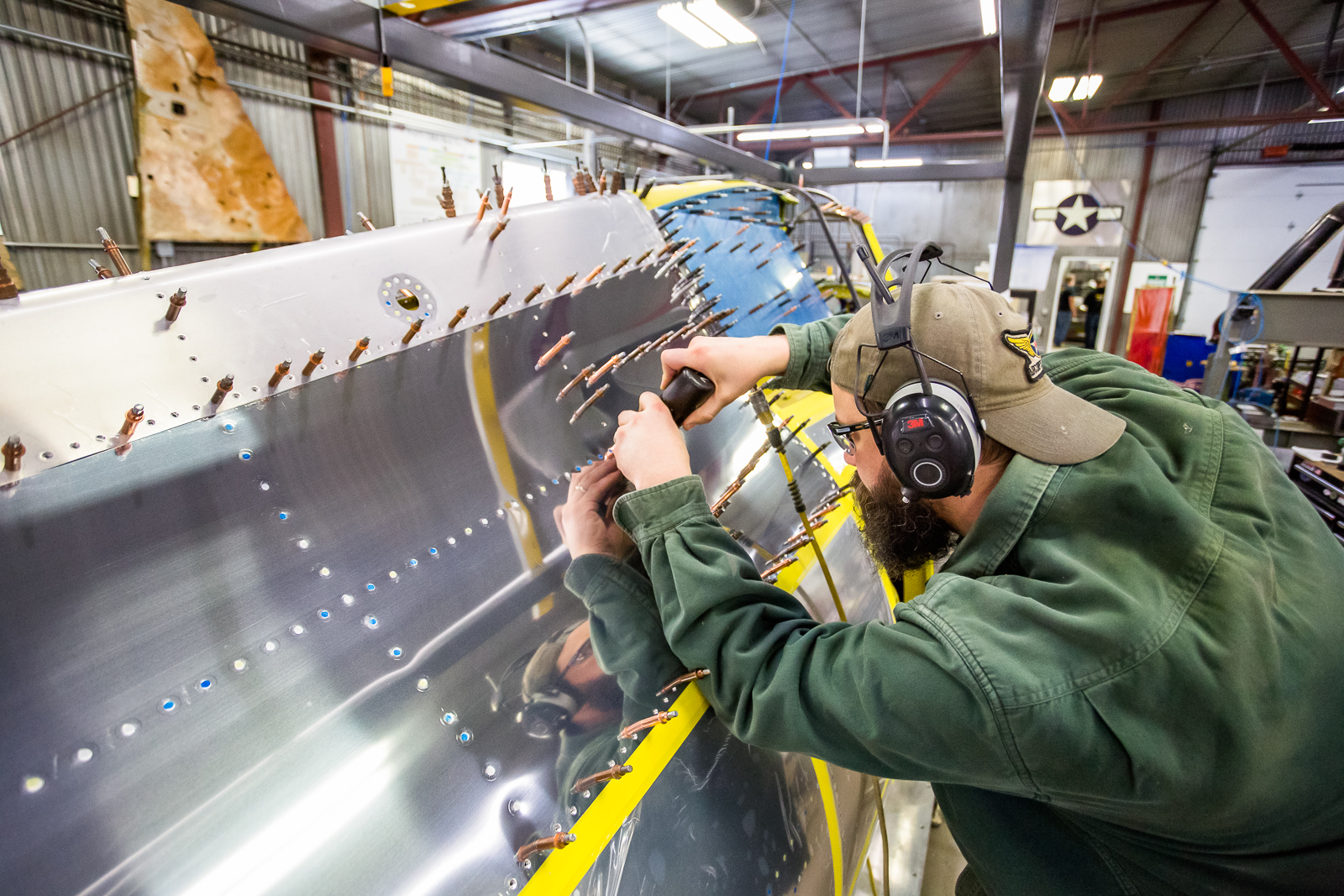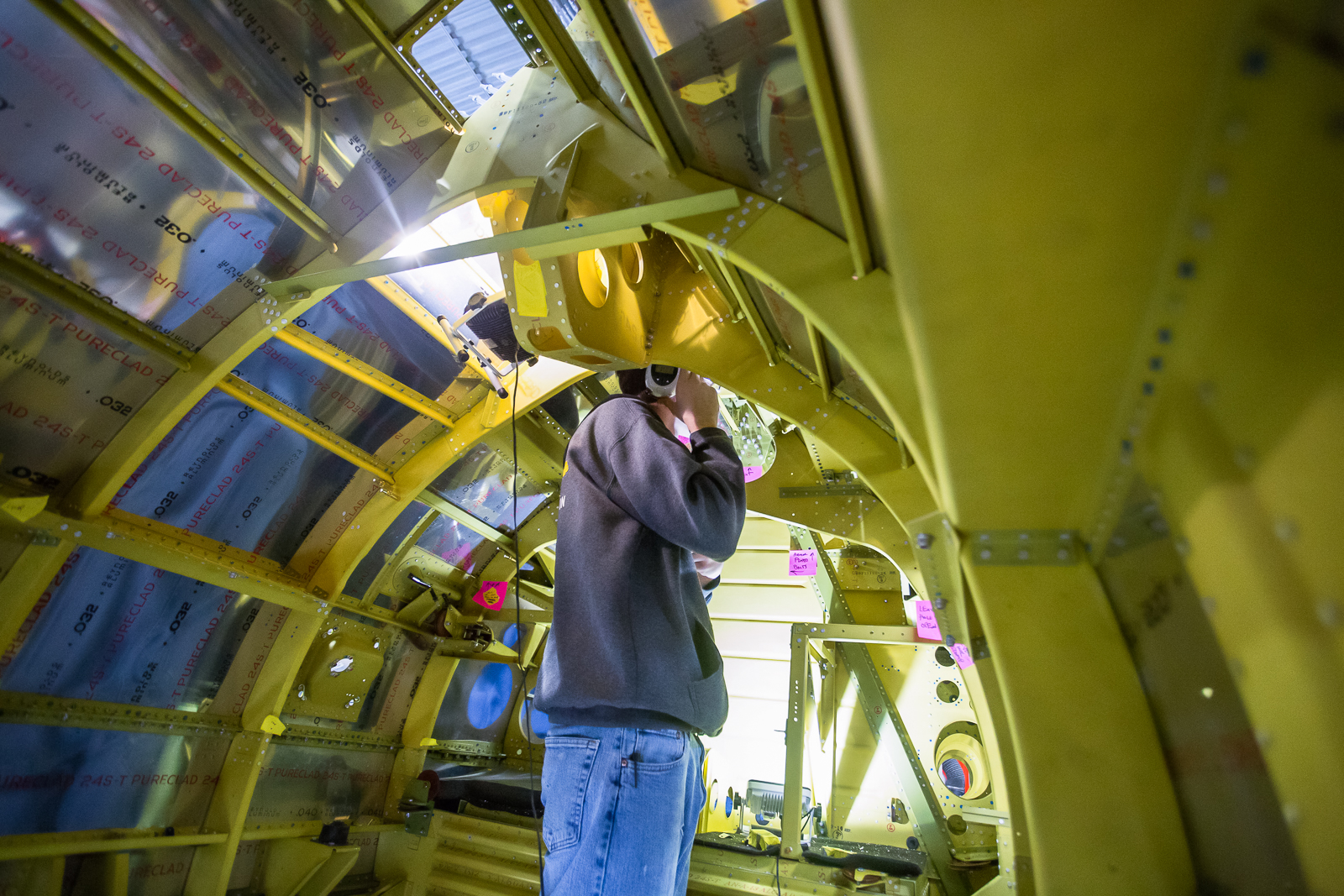 The Thunderbolt’s interior structure also adds complications to the job. With so many passages for ducting and reinforcement plates, there are numerous very tight spaces for bucking rivets. These are created by inner and outer walled off areas, even though overall, the inside of the fuselage is cavernous.