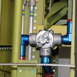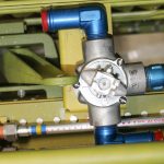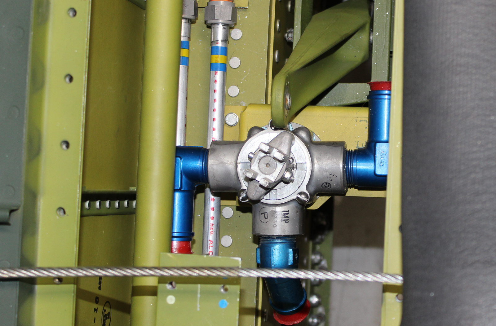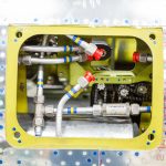 More hydraulic lines, the two routed to the left are for the main landing gear retract system, those routed to the right are the tail wheel retract lines. The lowest assembly is the flap relief valve. (photo by Chuck Cravens)