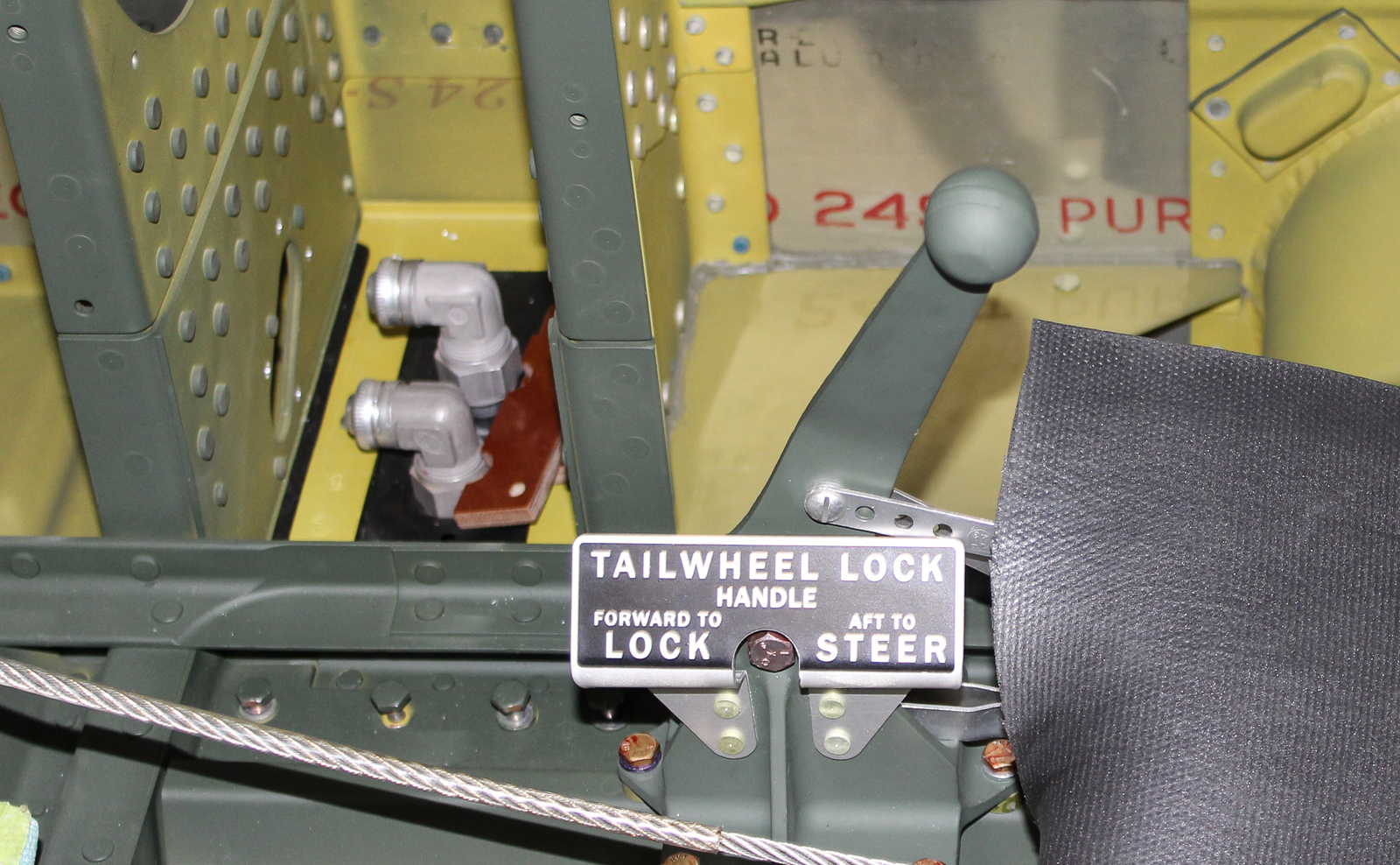 The tail wheel lock control lever is mounted on the cockpit floor, just to the right side of the pilot’s seat. (photo by Chuck Cravens)