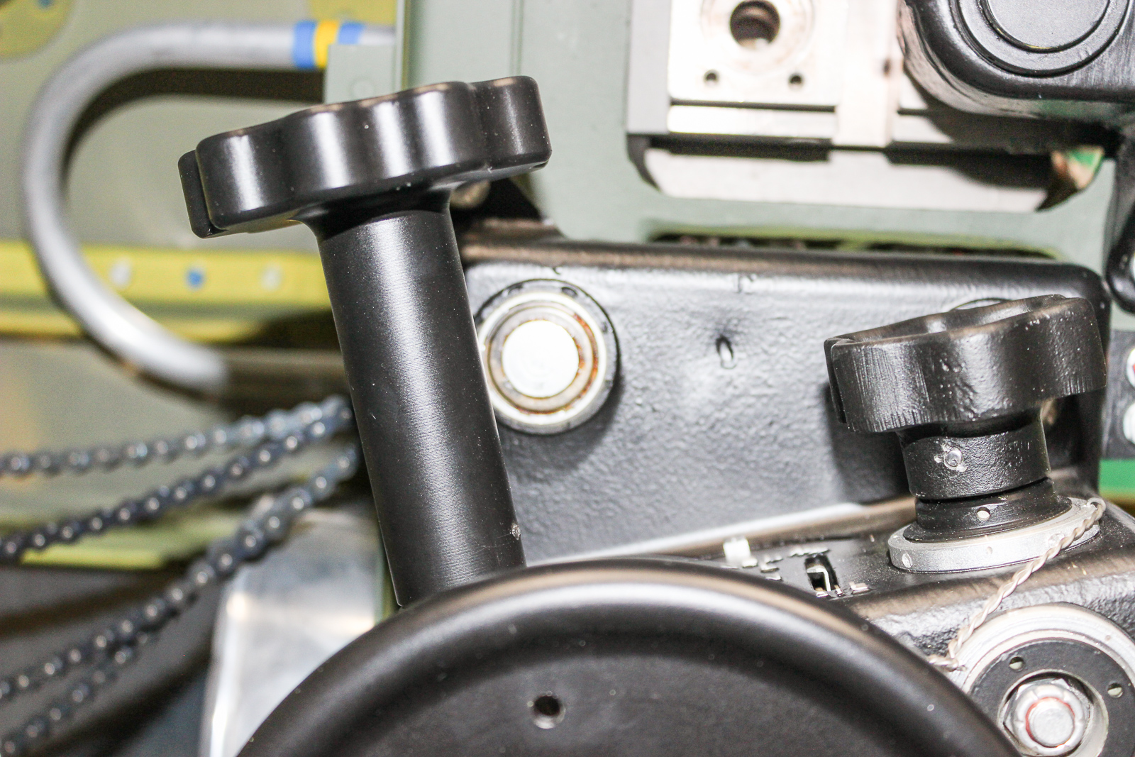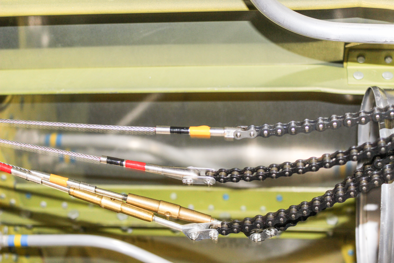 These are the chains and cables running rearward from the trim console. (photo by Chuck Cravens)