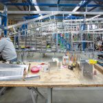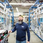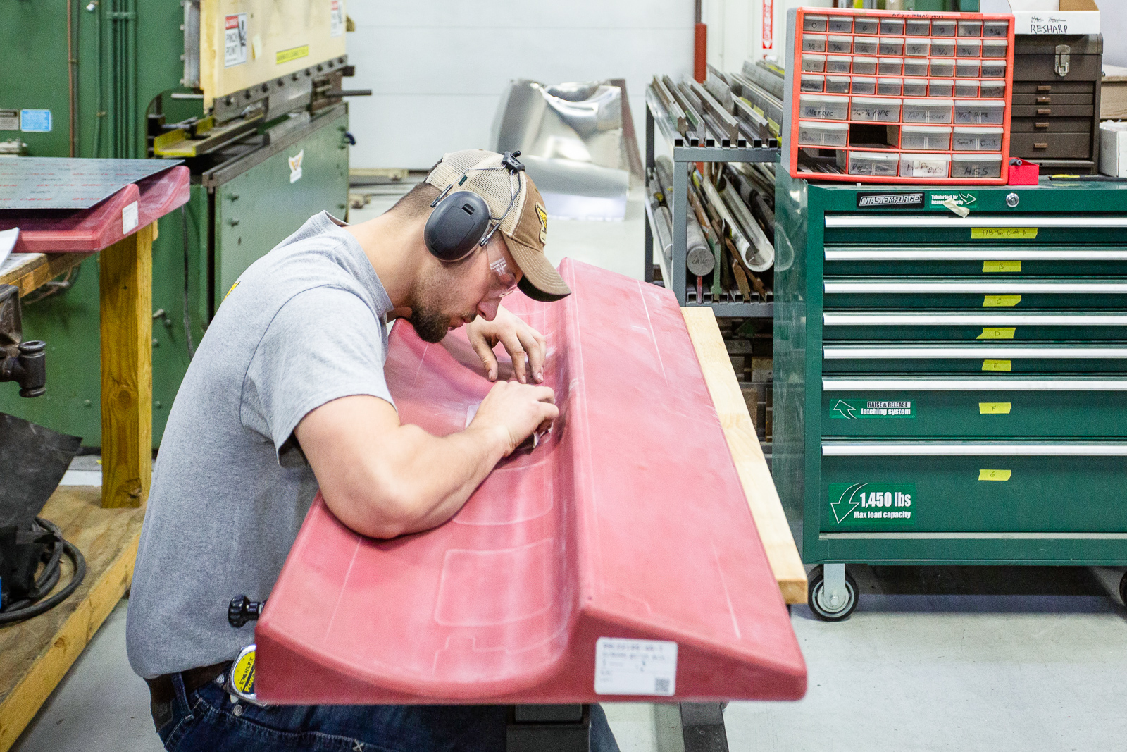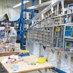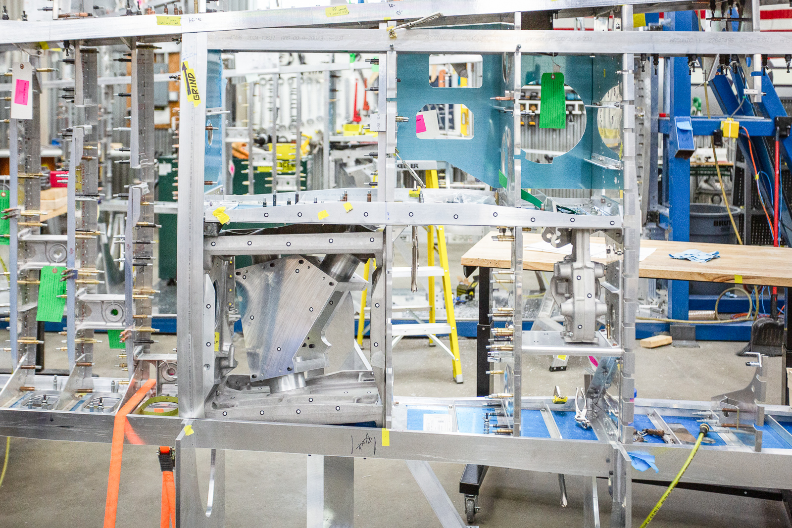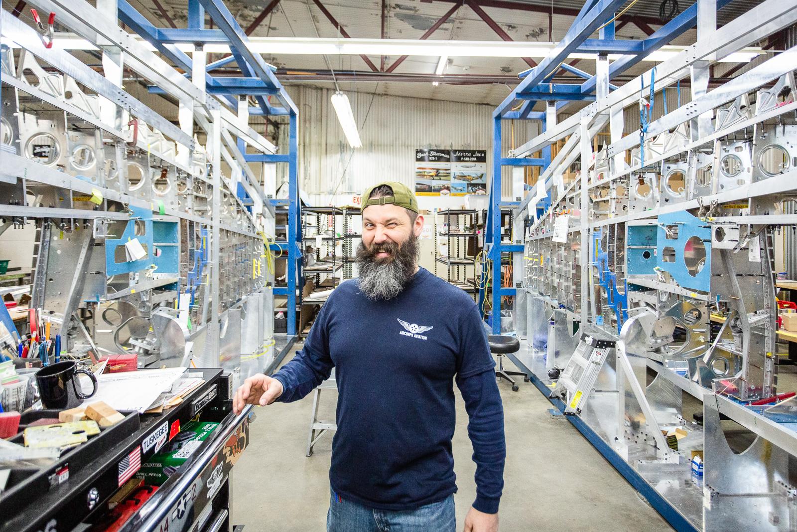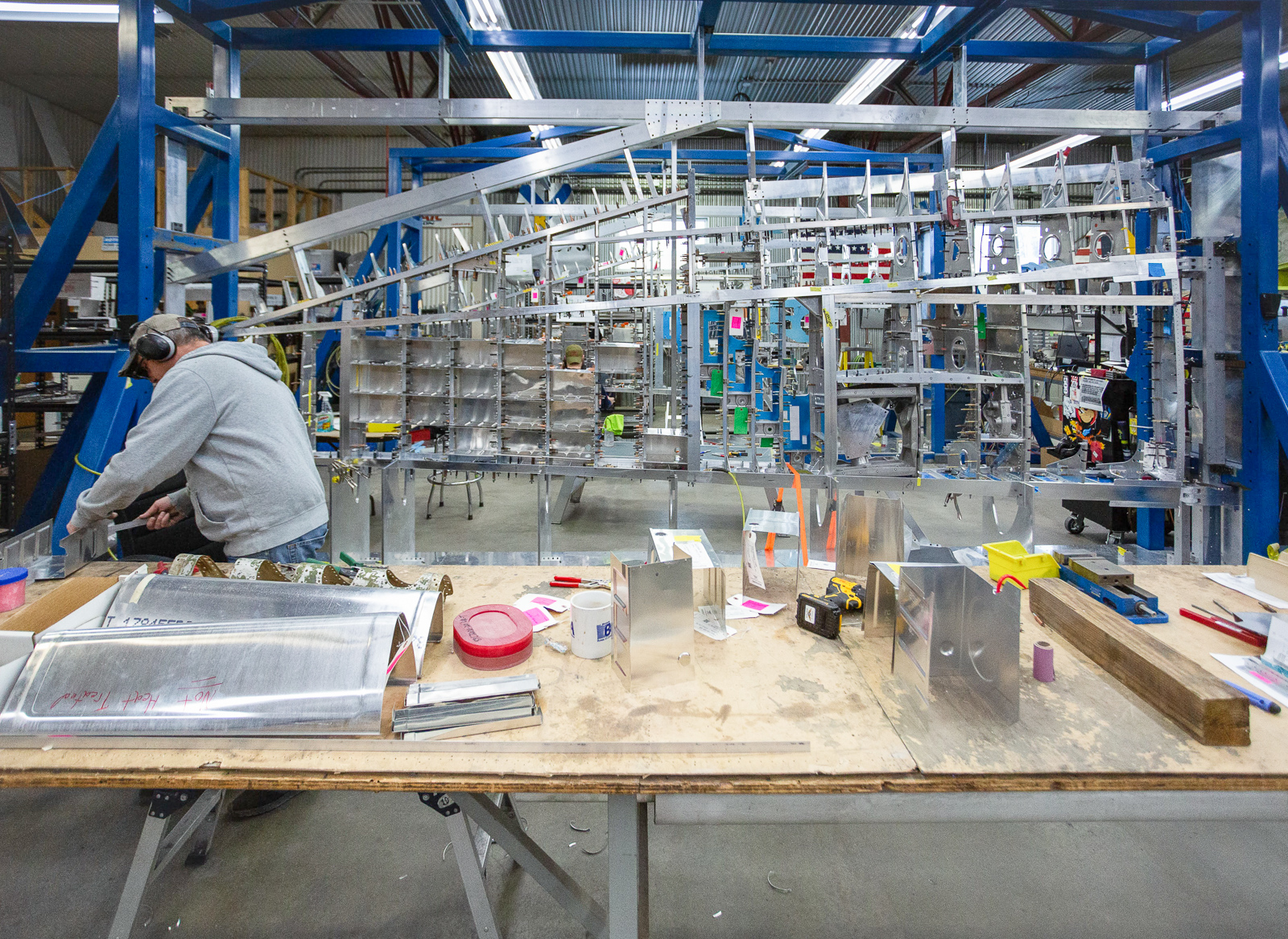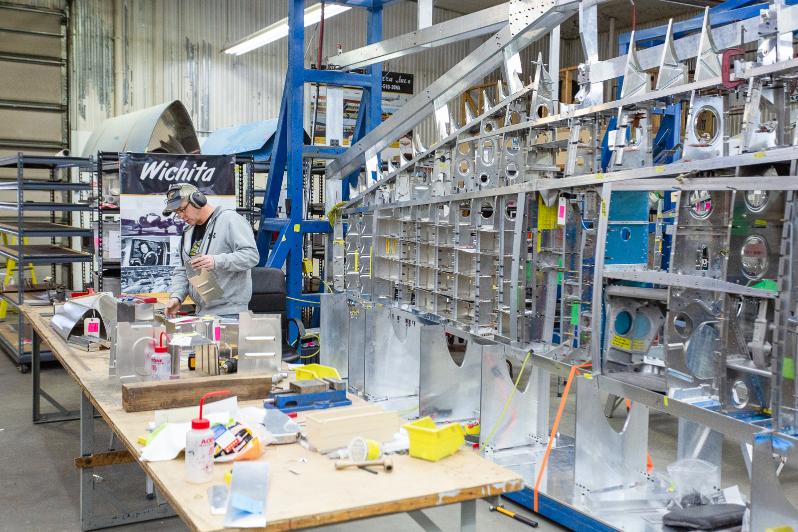 Robb works on wing parts at a bench. (photo via Chuck Cravens)