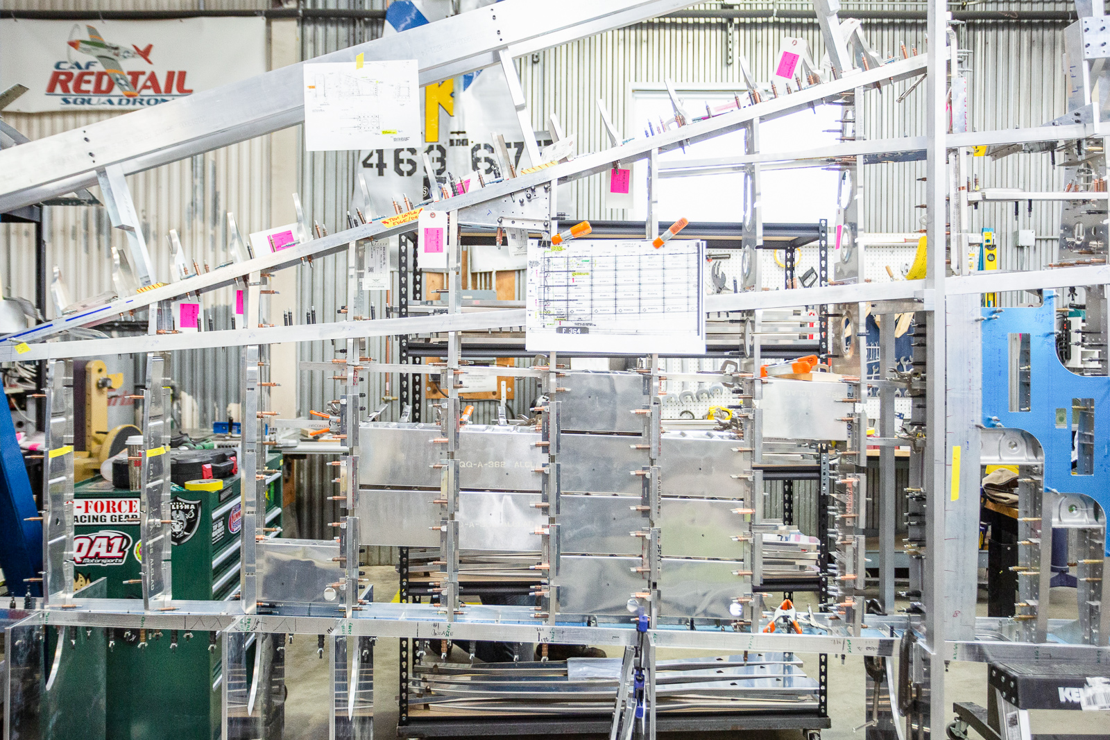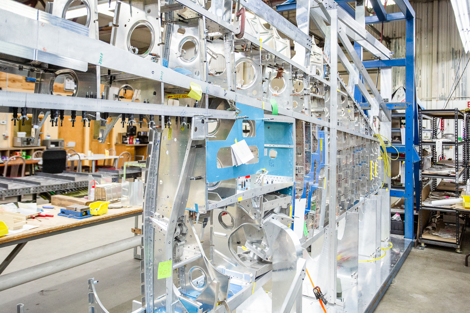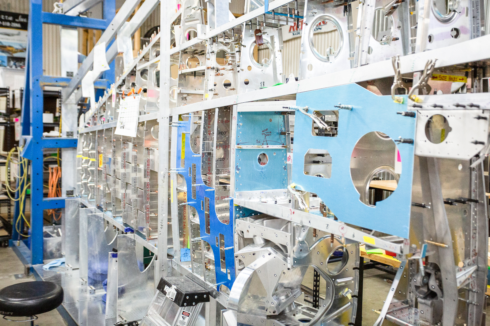 We can see what was on the bench in this shot. The curved aluminum parts are leading edge skin sections that go in the gun bay area. (photo via Chuck Cravens)