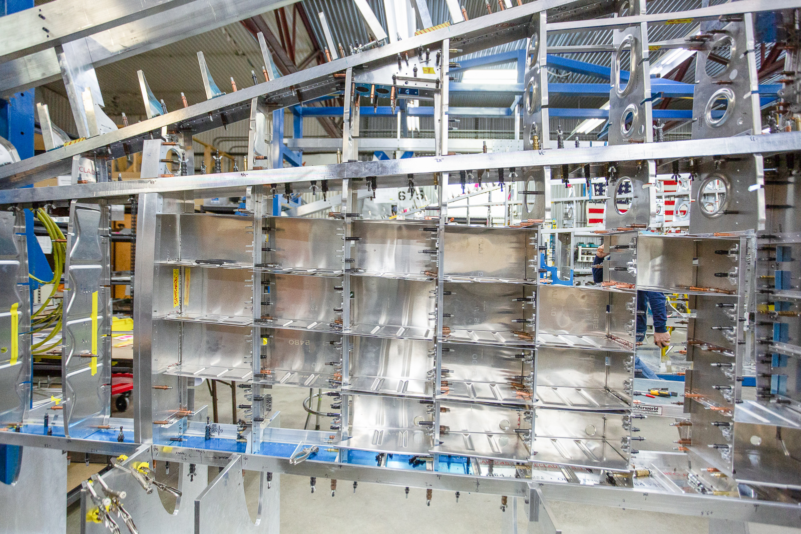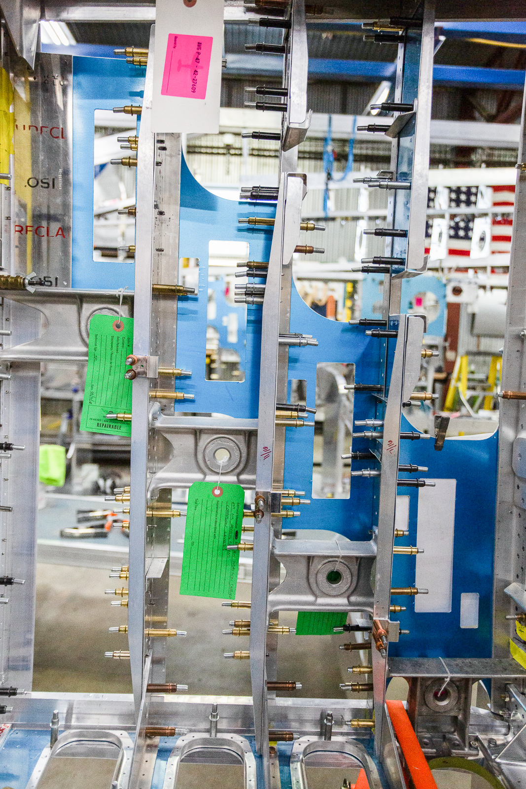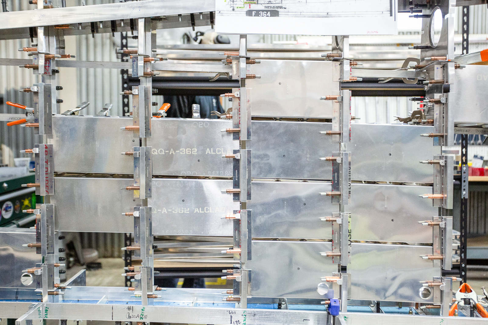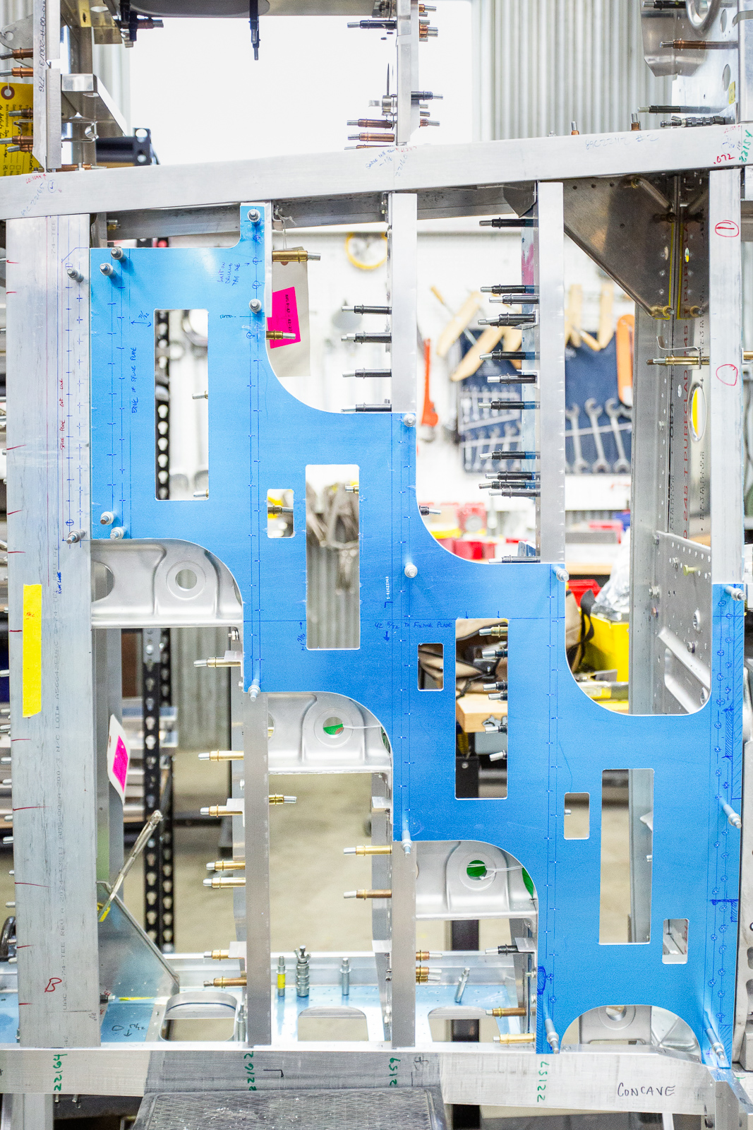 We can see what was on the bench in this shot. The curved aluminum parts are leading edge skin sections that go in the gun bay area. (photo via Chuck Cravens)