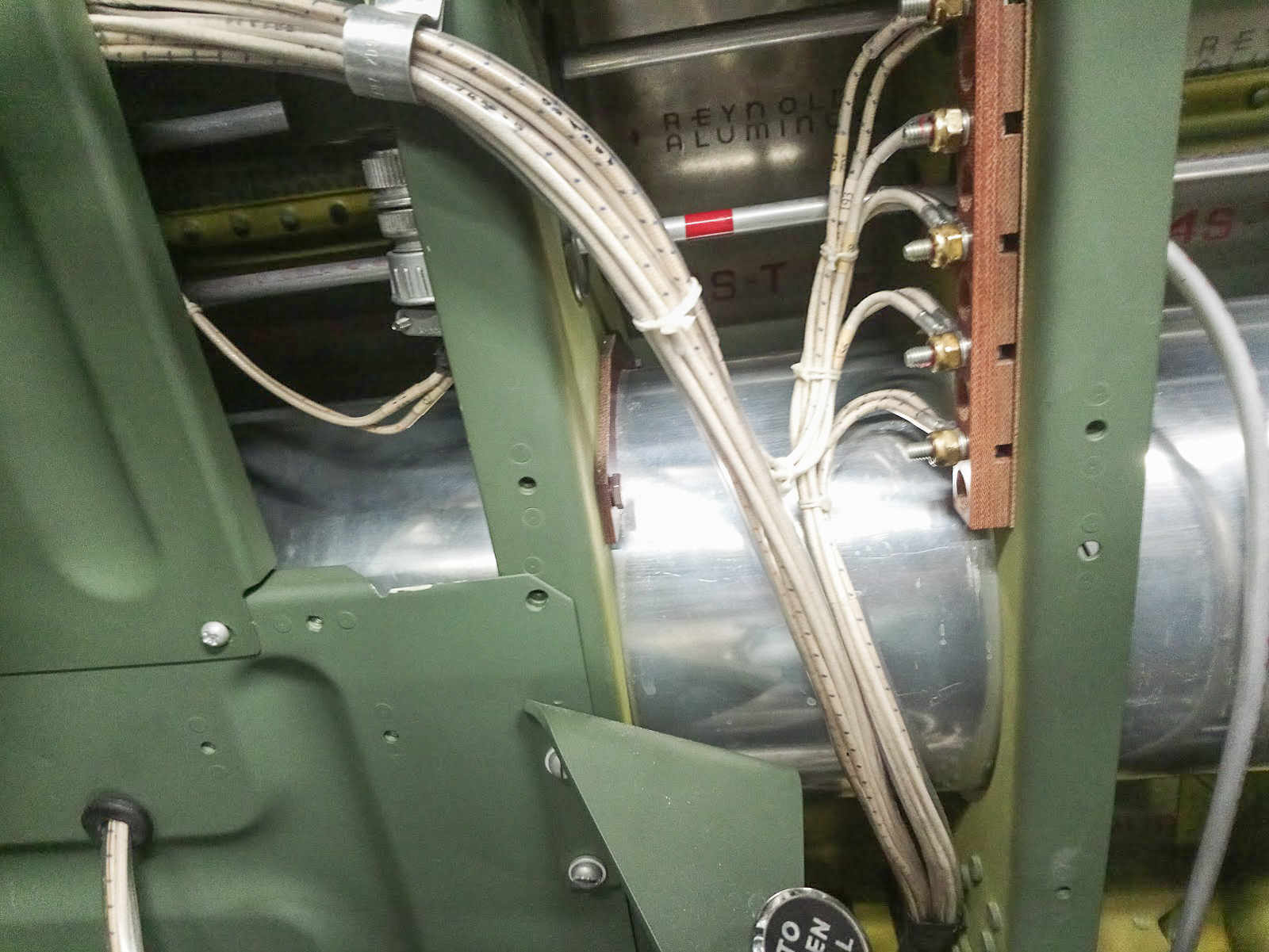 To accommodate the Christmas tree tank, the oxygen bottle mounting bracket was moved back in the fuselage to this location in front of the intercooler doors. (image via AirCorps Aviation)