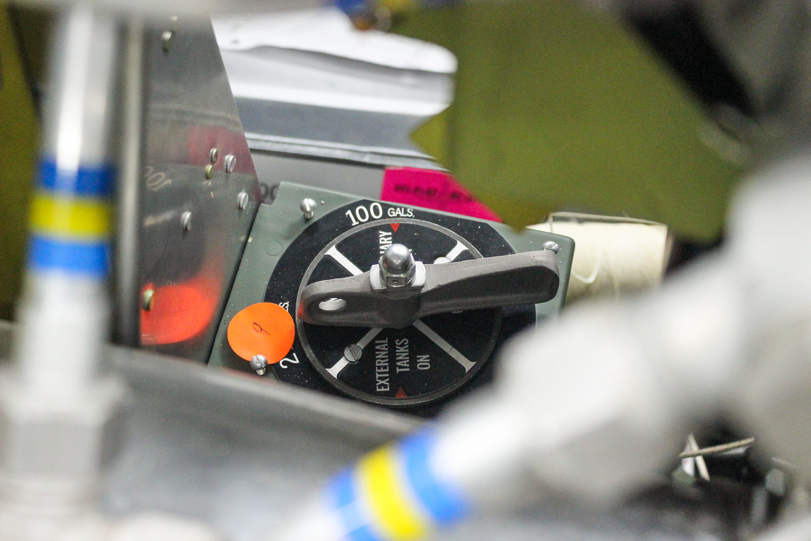 This is the main fuel selector switch. It allows the pilot to choose between main, auxiliary, or drop tanks. Below and connected to it, is an electrical selector that activates the appropriate fuel pump for the tank selected. (image via AirCorps Aviation)