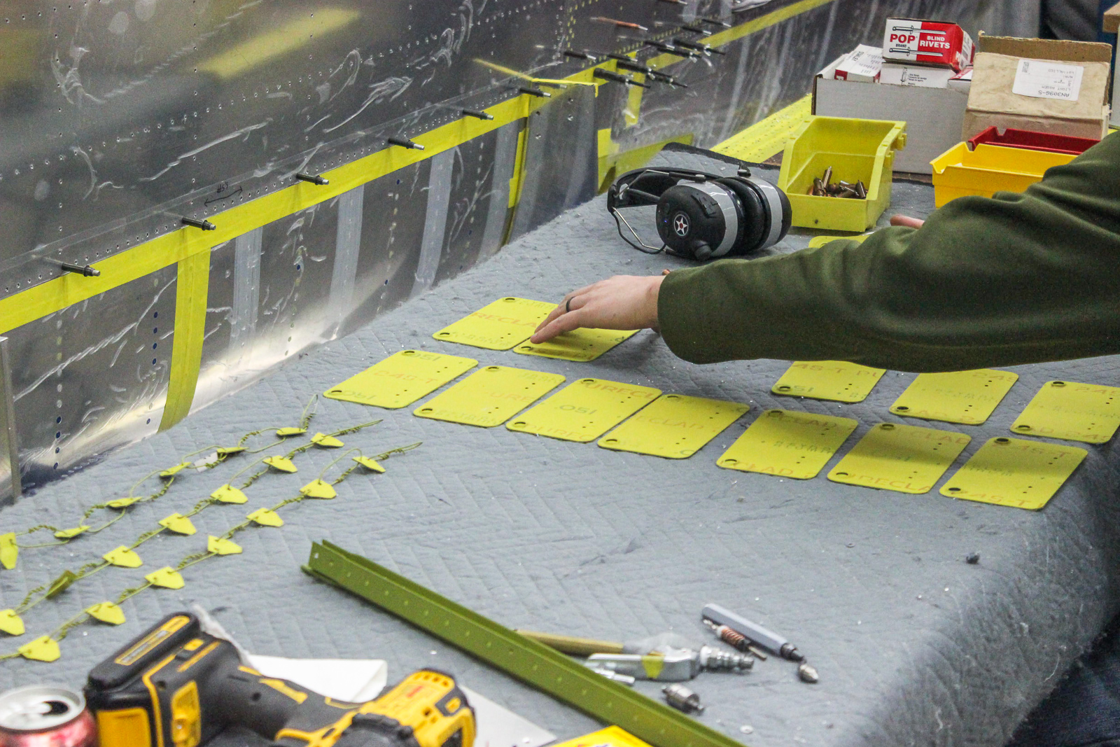 Corey works on inspection hole covers that will cover the openings visible in front of the flap and aileron positions near the top of this photo.. (image via AirCorps Aviation)