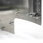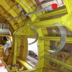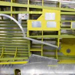 Several of these panels already have their covers installed – like the ones on the yellow zinc chromated reinforcing plate on the image above. The line of rectangular openings in the skin angling across the upper right of the photo are for inspection access covers for the flaps and ailerons.
