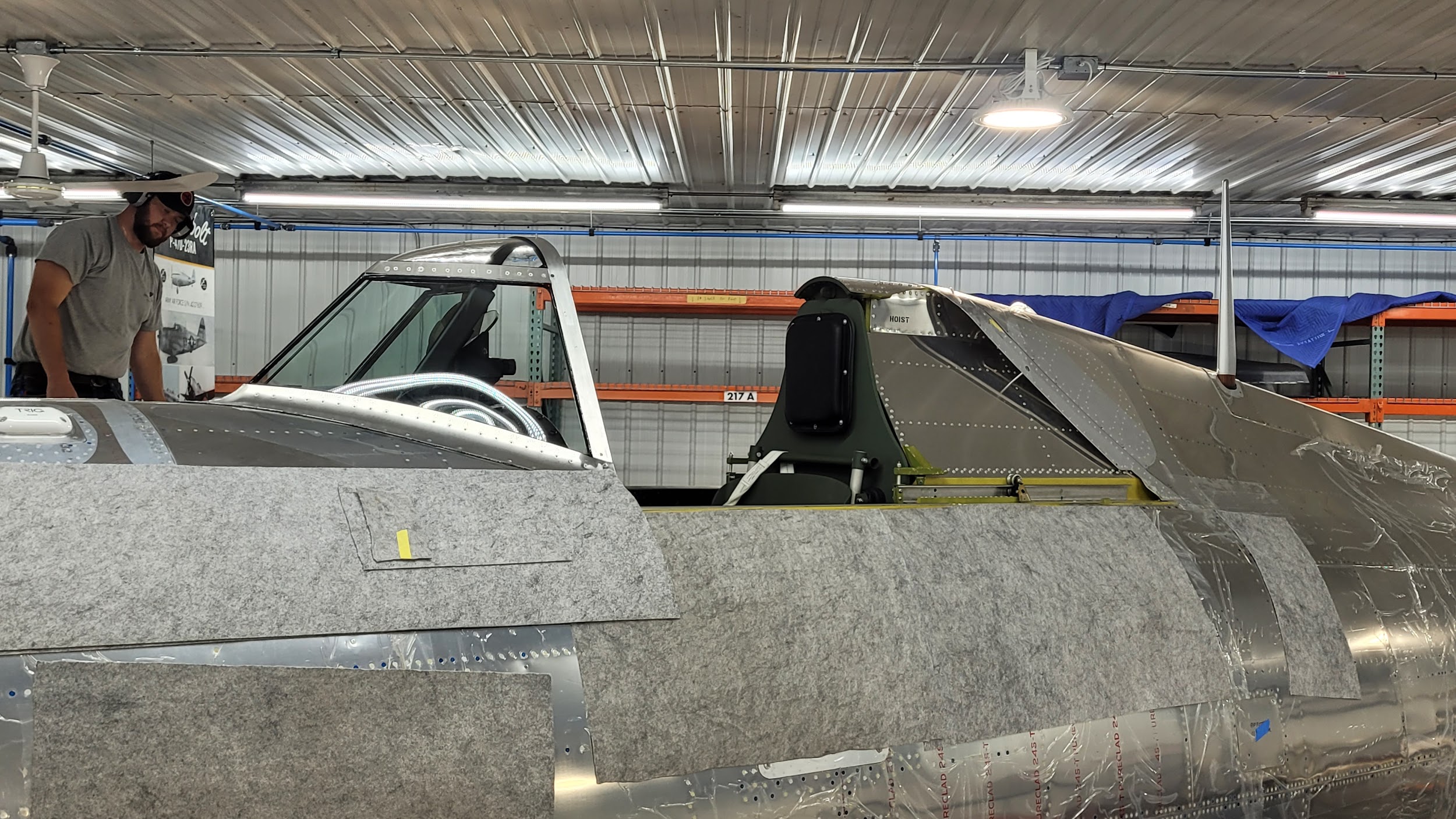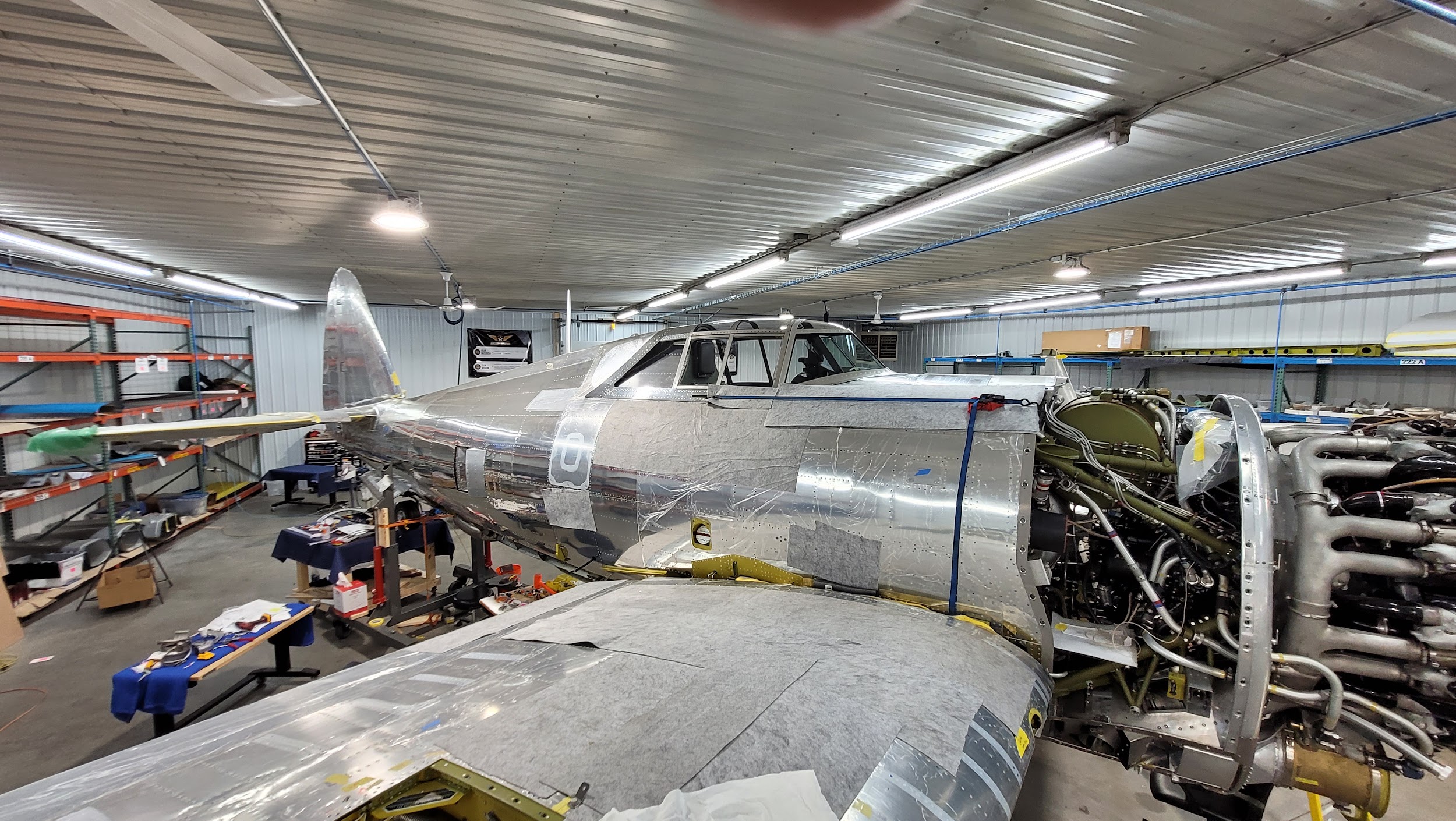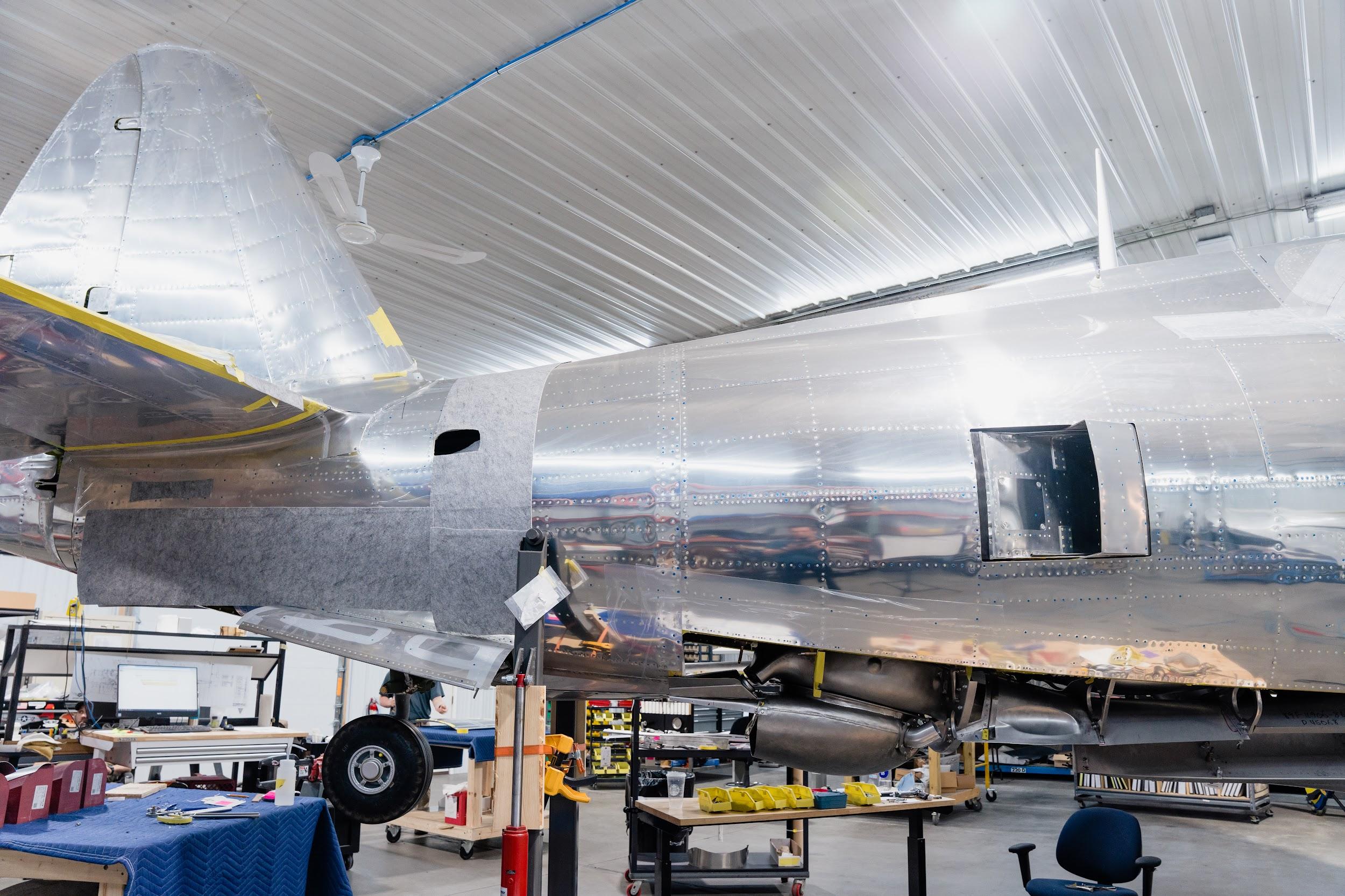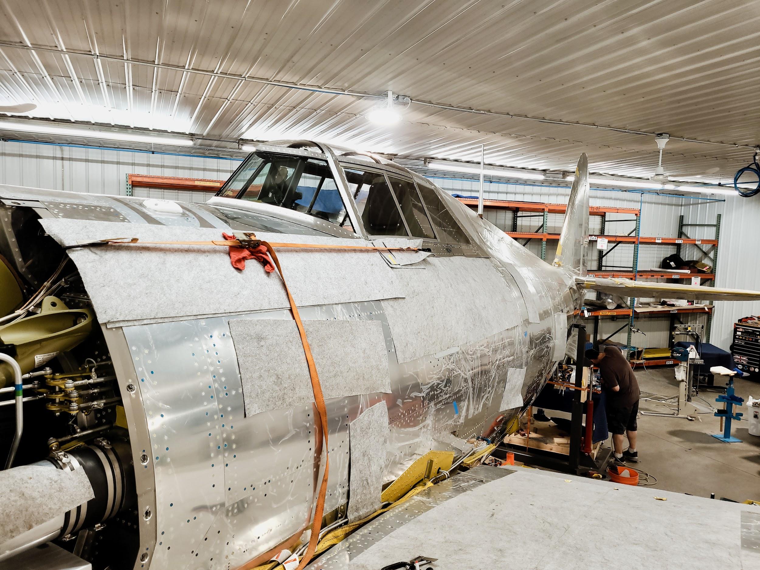 The characteristic razorback cockpit enclosure has been installed on the P-47. It really adds to the finished look of what will soon become the only Republic-built P-47 razorback flying.