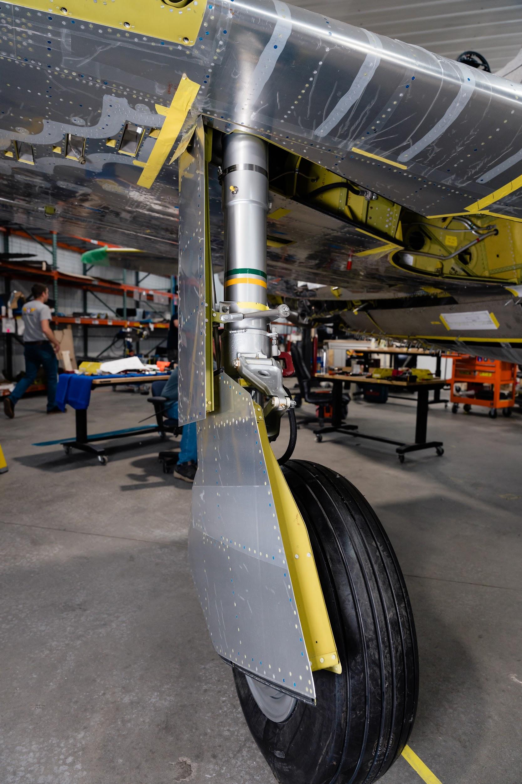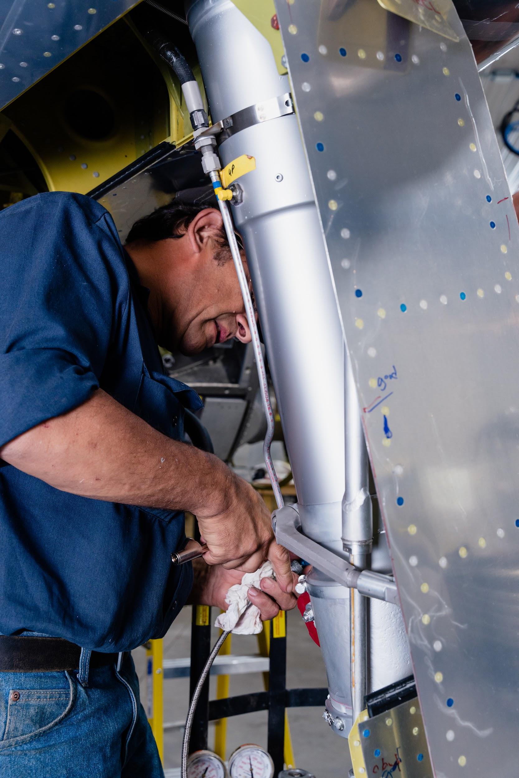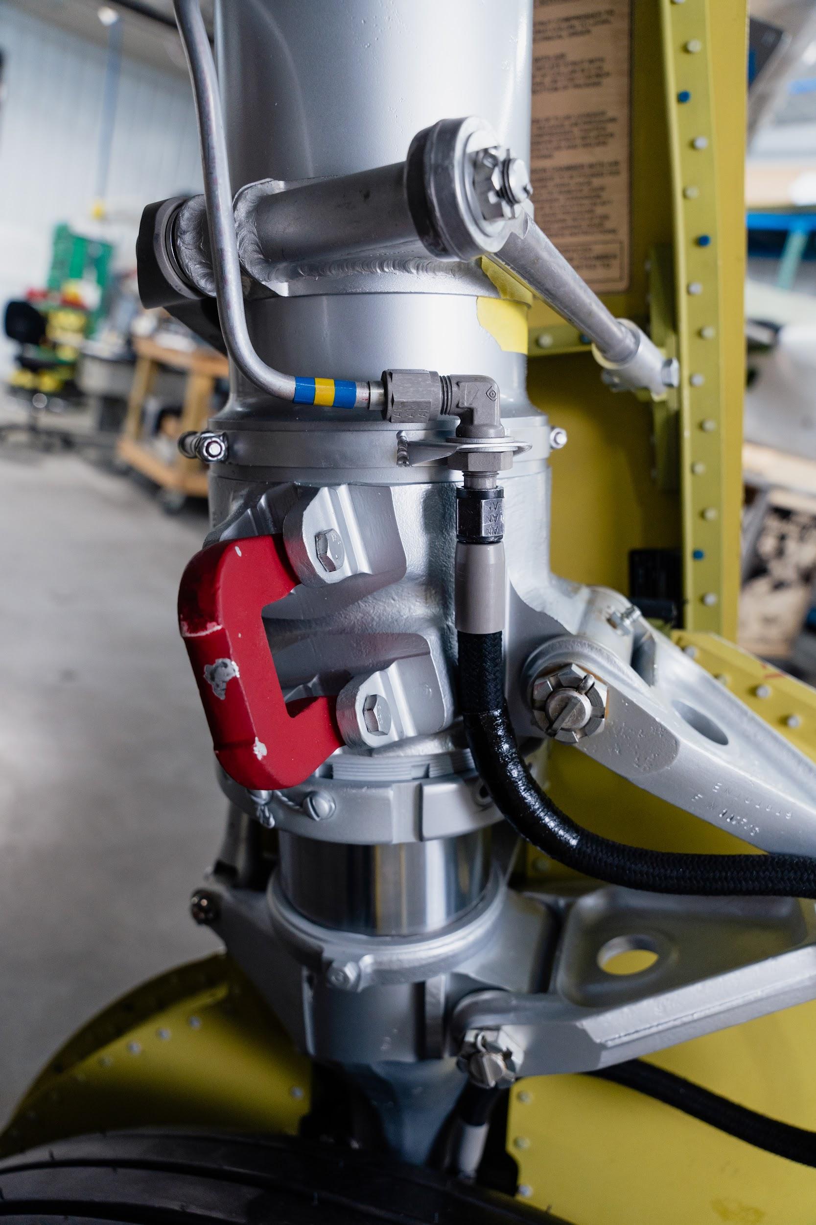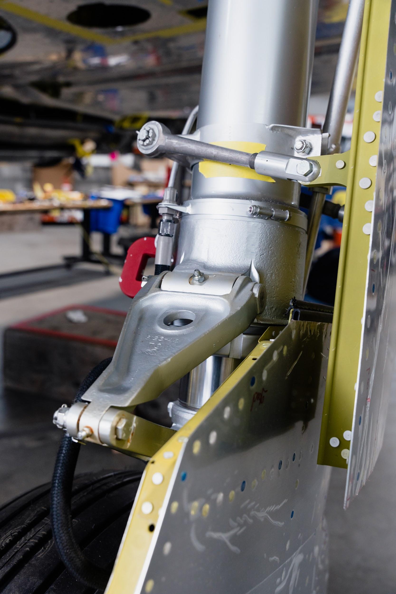 One important project this month involved filling the reservoirs for the main landing gear oleo struts. Oleo struts are a kind of fluid-spring shock absorber filled with gas (nitrogen in this case) and hydraulic fluid.