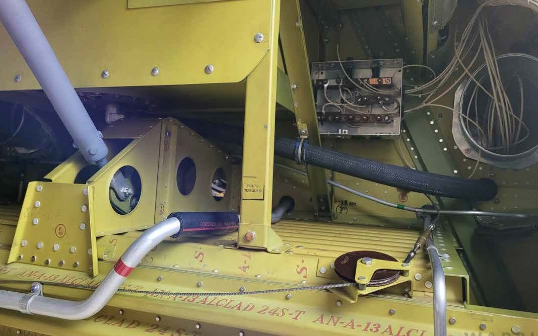 Aaron has completed the final items of the unique Christmas tree tank installation. This was a particularly challenging aspect of 42-27609’s restoration because none of the details regarding this installation are documented in any known Republic engineering drawings. This lack of original manufacturing drawings isn’t unusual for field modifications such as this auxiliary tank, so Aaron had to follow the way things were done in 1944 by carefully examining and documenting 42-27609’s modified fuselage systems during their disassembly for inspection.
