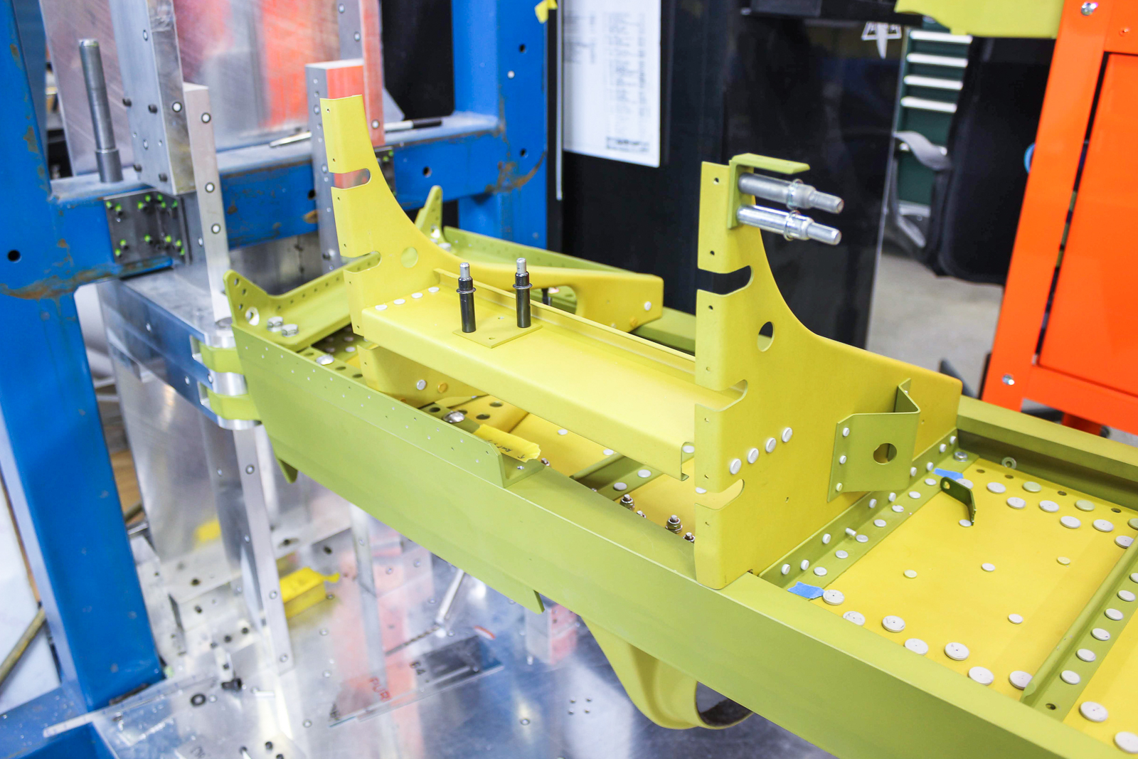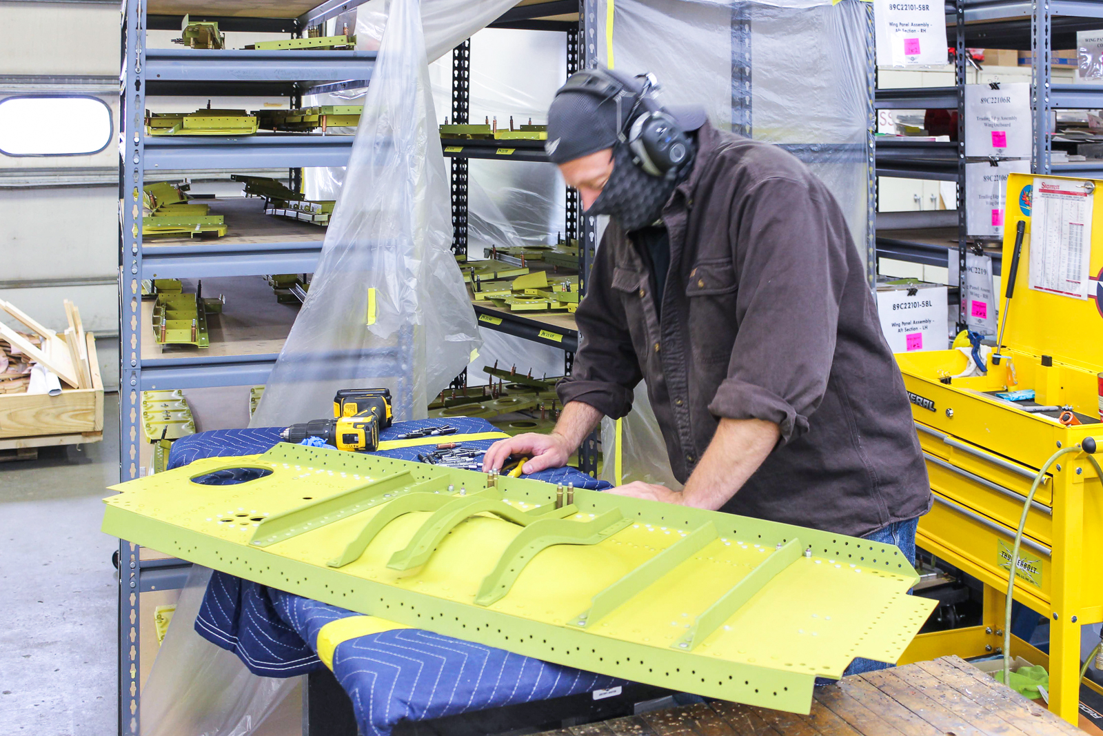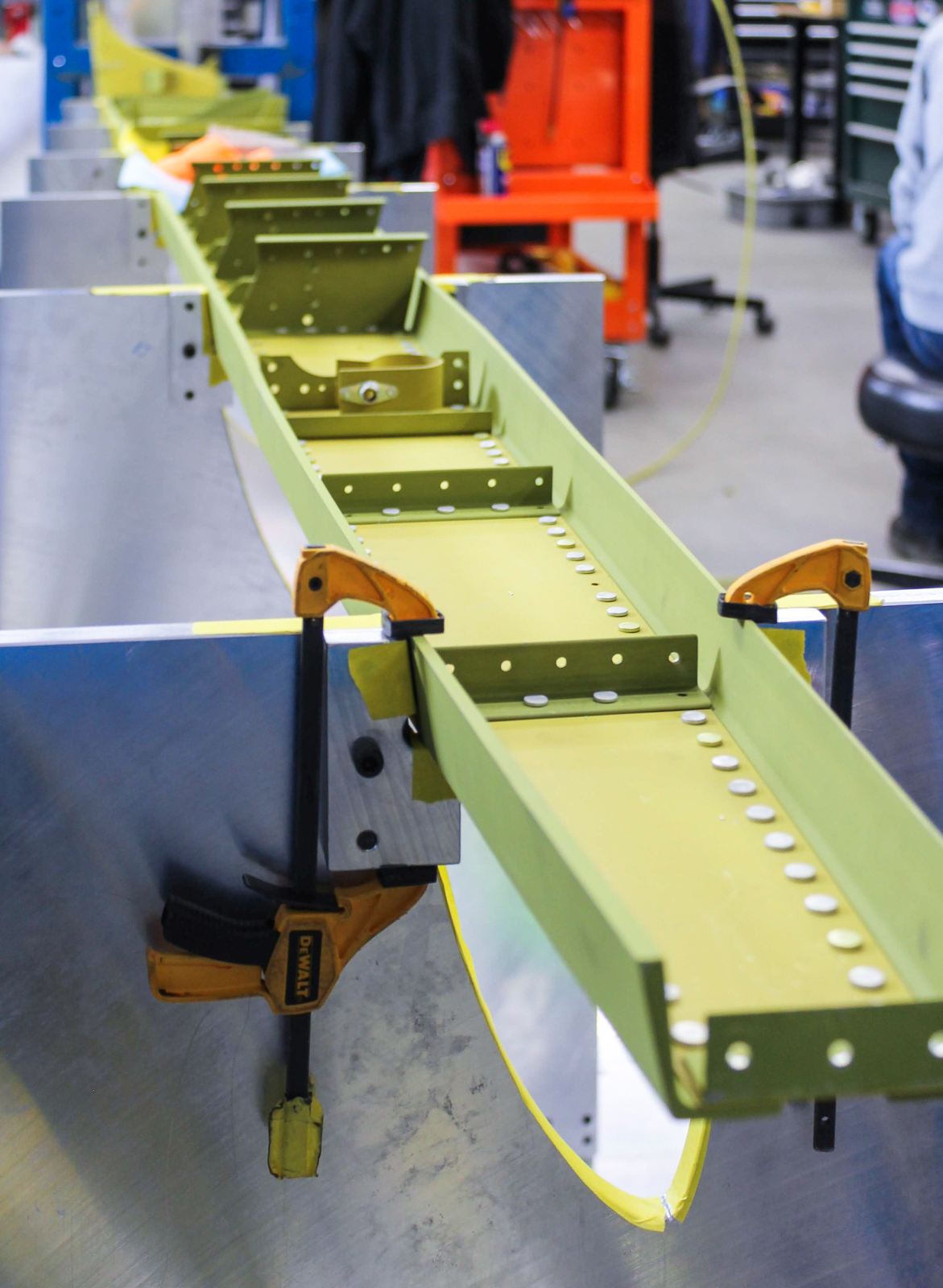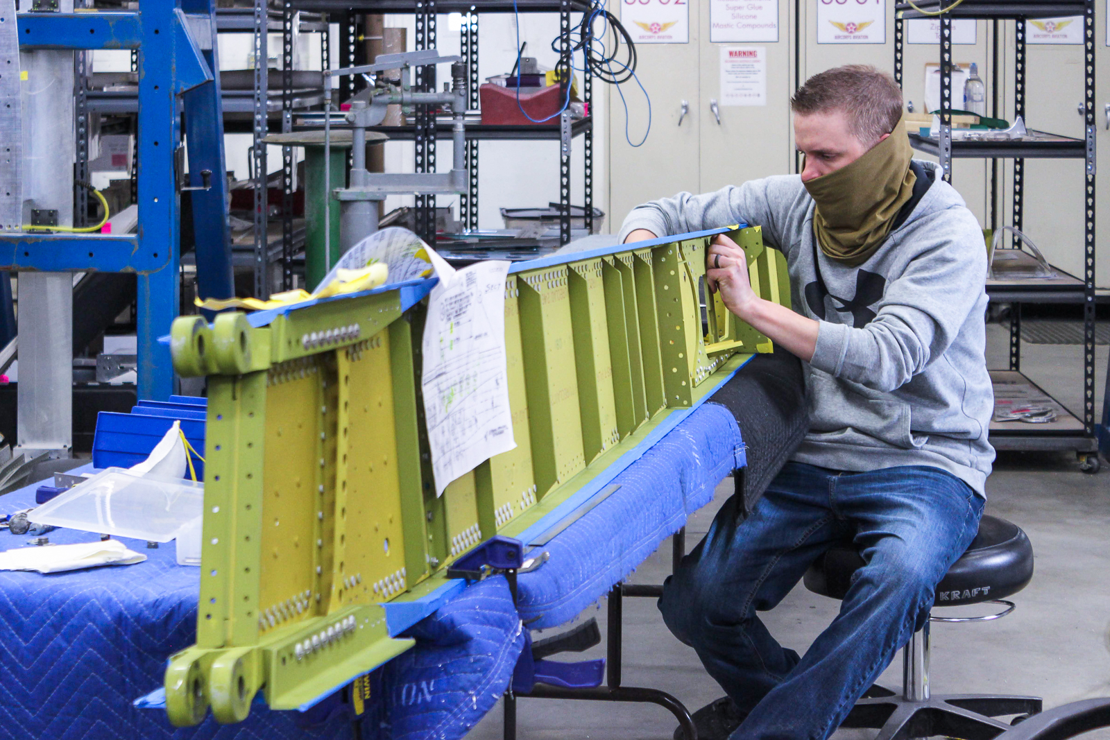 Cory works on final assembly of the main spar (89C22111-54 Spar #1). It has been anodized and painted. (photo via AirCorps Aviation)