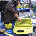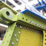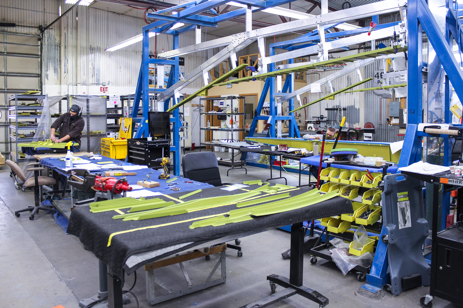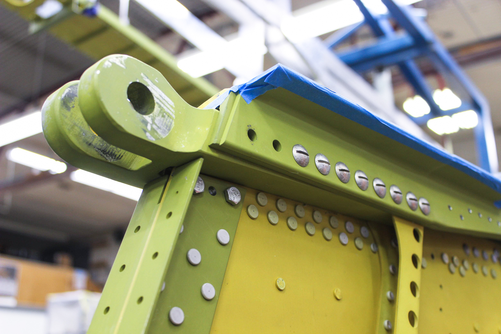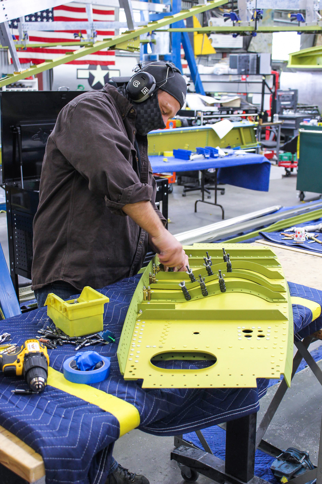 Cory works on final assembly of the main spar (89C22111-54 Spar #1). It has been anodized and painted. (photo via AirCorps Aviation)
